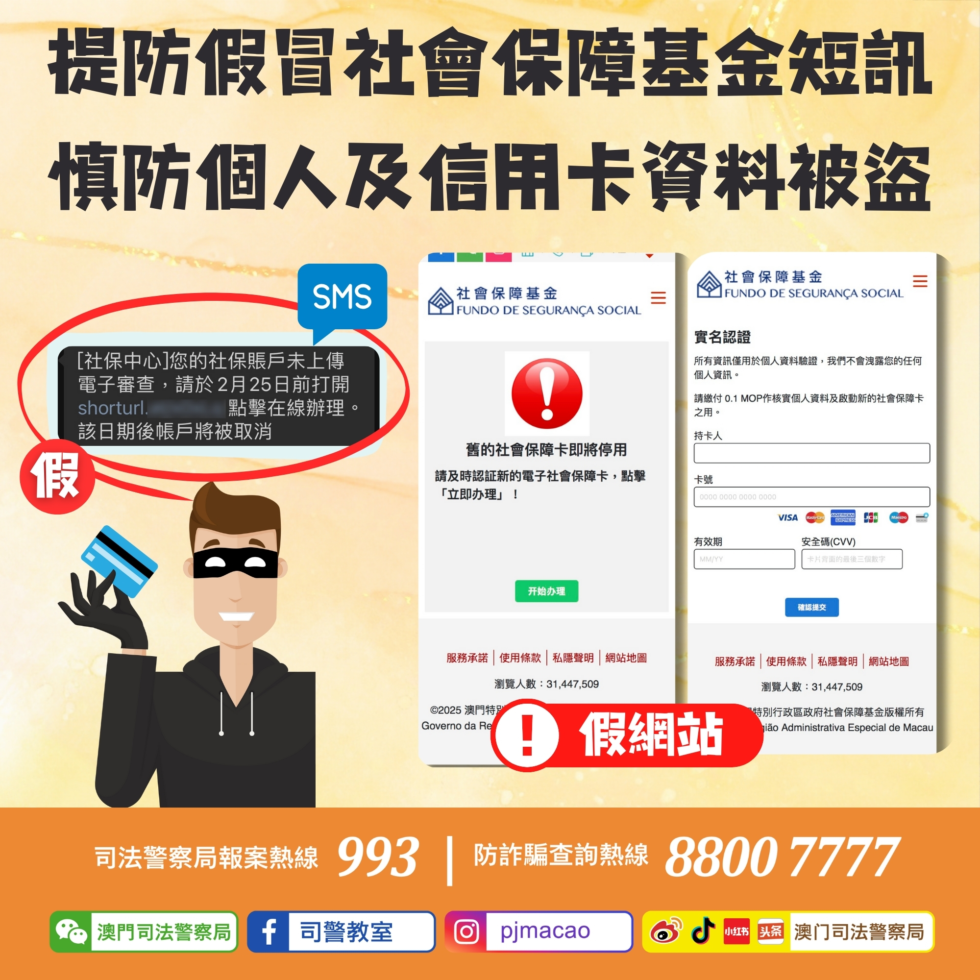 司法警察局今日接獲社會保障基金檢舉,指有人冒充社會保障基金發出釣魚短訊,內容聲稱“社保帳戶未上傳電子審查”,要求市民點擊短訊內附帶的連結,否則將註銷帳戶。