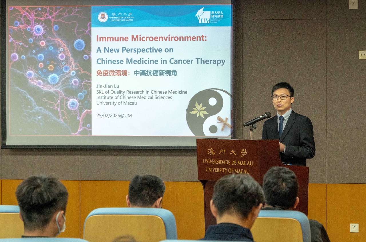 澳門大學今(25)日舉行“澳大學人研究講壇”第24講,由澳大中華醫藥研究院教授陸金健以“免疫微環境:中藥抗癌新視角”為題,分享其在相關領域的深入研究成果。講座現場反應熱烈,亦有不少中學師生以線上形式參與。
