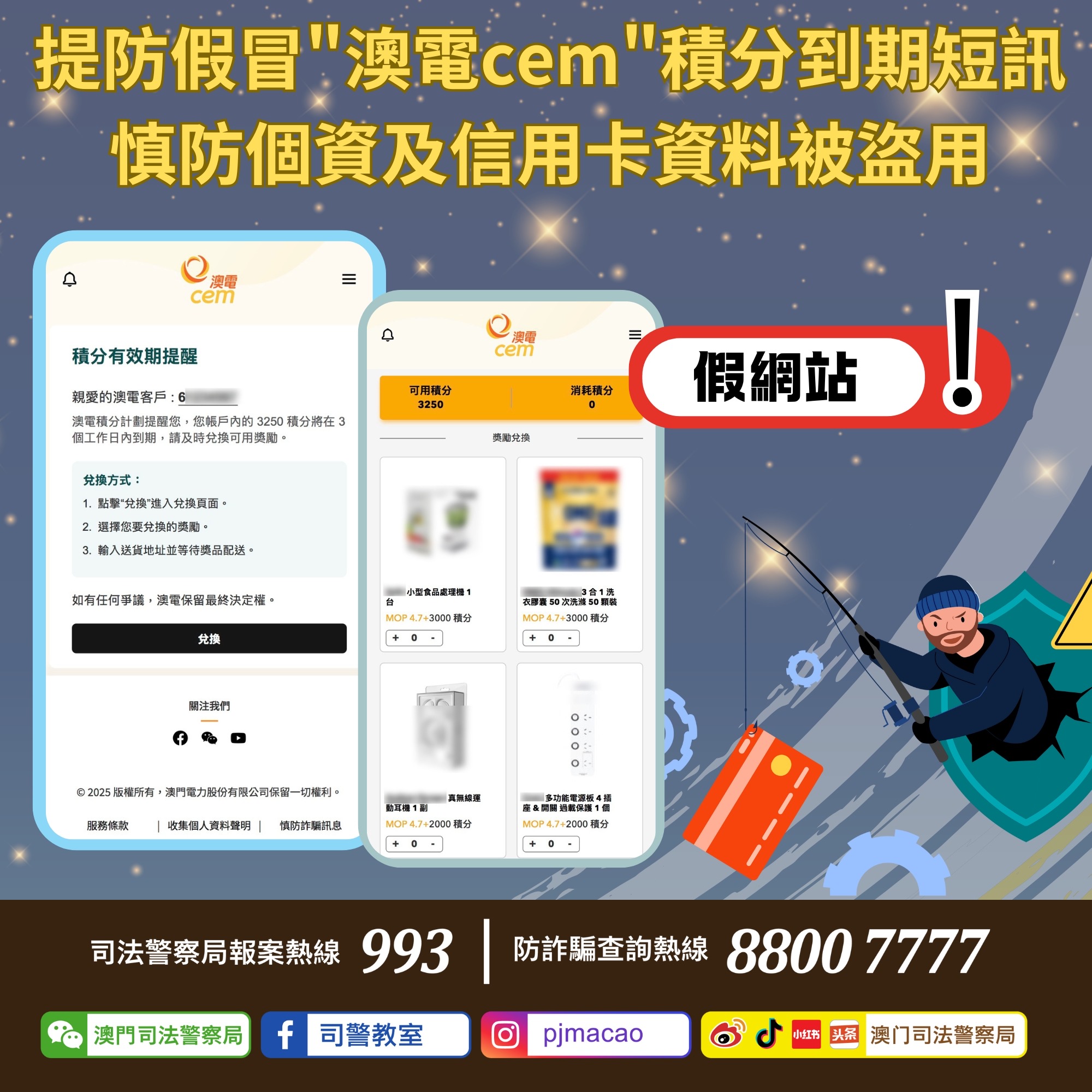 司警局於今日發現有騙徒假冒“澳電cem”濫發釣魚短訊,短訊內容訛稱市民的積分即將到期,可登入短訊內附帶之連結以積分及低價換購禮品,誘騙市民輸入信用卡資料,騙徒成功套取後再進行非授權的大額交易。