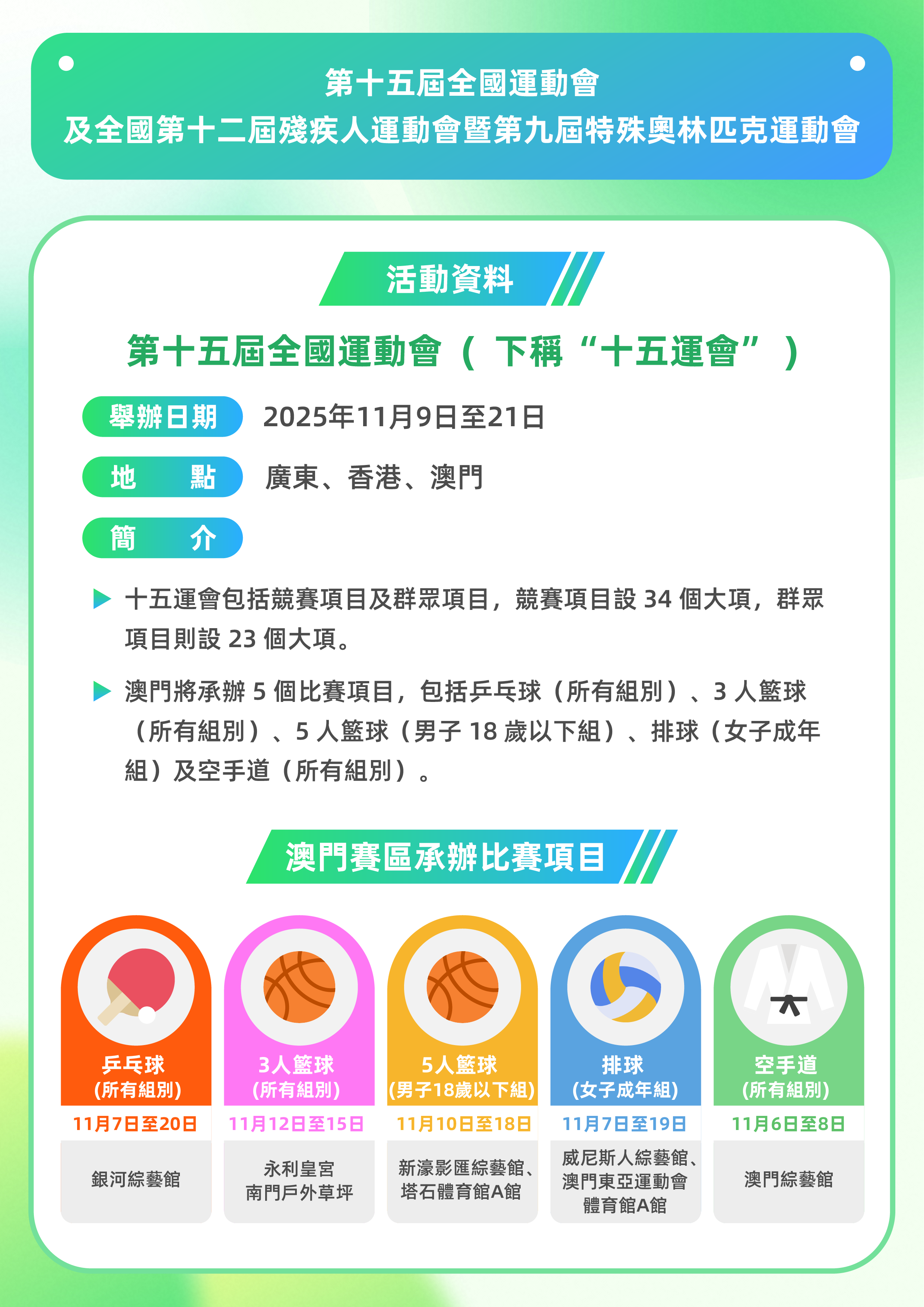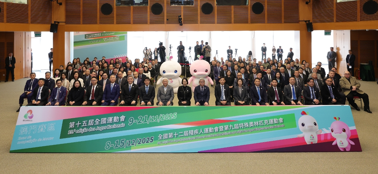 首次由廣東、香港、澳門聯合承辦的我國最高水平、最大型的綜合性運動會 - 十五運會及殘特奧會將於今年11月及12月舉行,澳門賽區將承辦十五運會的5個比賽項目,包括乒乓球、3人籃球、5人籃球(男子18歲以下組)、排球(女子成年組)及空手道,以及殘特奧會的2個羽毛球比賽項目(肢障/聾人組及智障組)。比賽地點選址澳門東亞運動會體育館、塔石體育館、澳門綜藝館、銀河綜藝館、永利皇宮南門戶外草坪、新濠影匯綜藝館、威尼斯人綜藝館。同時,廣東、香港、澳門亦將於11月聯合舉辦十五運會公路自行車男子個人賽,是十五運會中唯一跨越粵港澳三地的比賽項目。