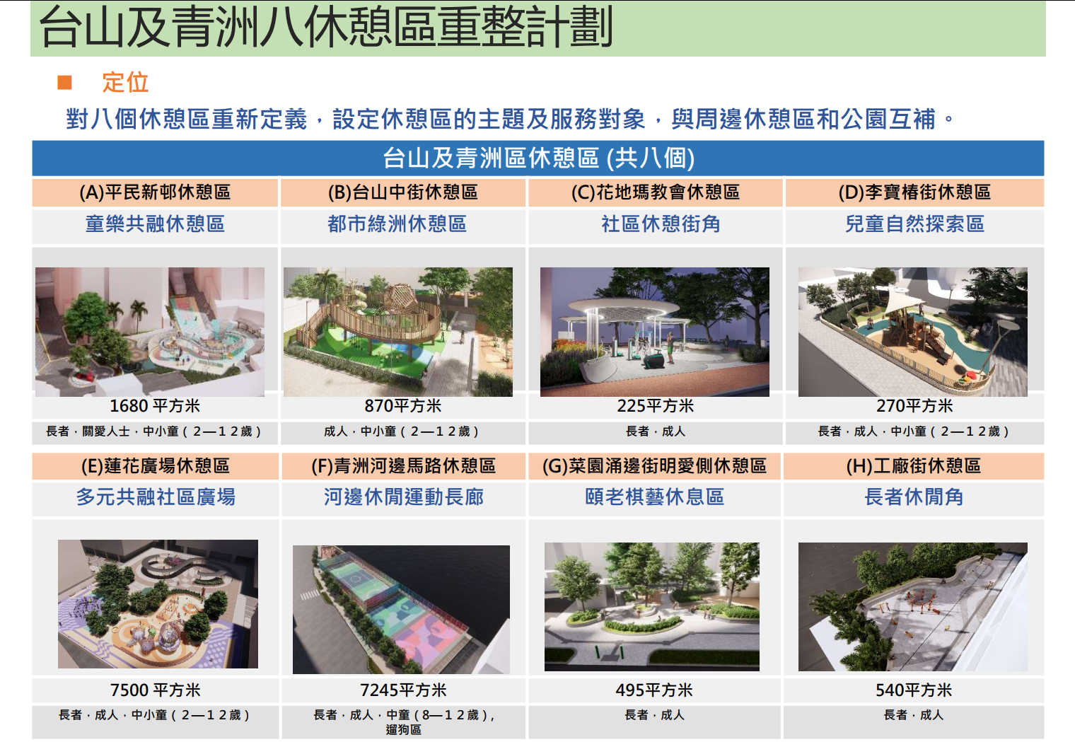 鑑於台山及青洲區人口密集,兒童及中老年人較多,區内亦有相當數量的托兒所、幼稚園、中小學校,社服設施,對遊樂及康體設施需求越來越高,而區內現有的休憩區已使用多年,設施存在老化和單一等問題,故此,市政署分階段重整區內八個休憩區,包括:台山中街休憩區、花地瑪教會休憩區、平民新村休憩區、李寶椿街休憩區、菜園涌邊街明愛側休憩區、工廠街休憩區、蓮花廣場休憩區、青洲河邊馬路休憩區。