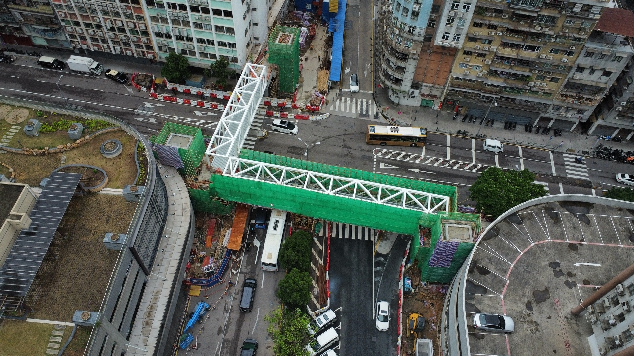 沙梨頭海邊大馬路行人天橋建造工程(第一期)的天橋鋼結構吊裝工作已於本月29日凌晨順利完成,標誌着項目建設提早取得階段性進展。