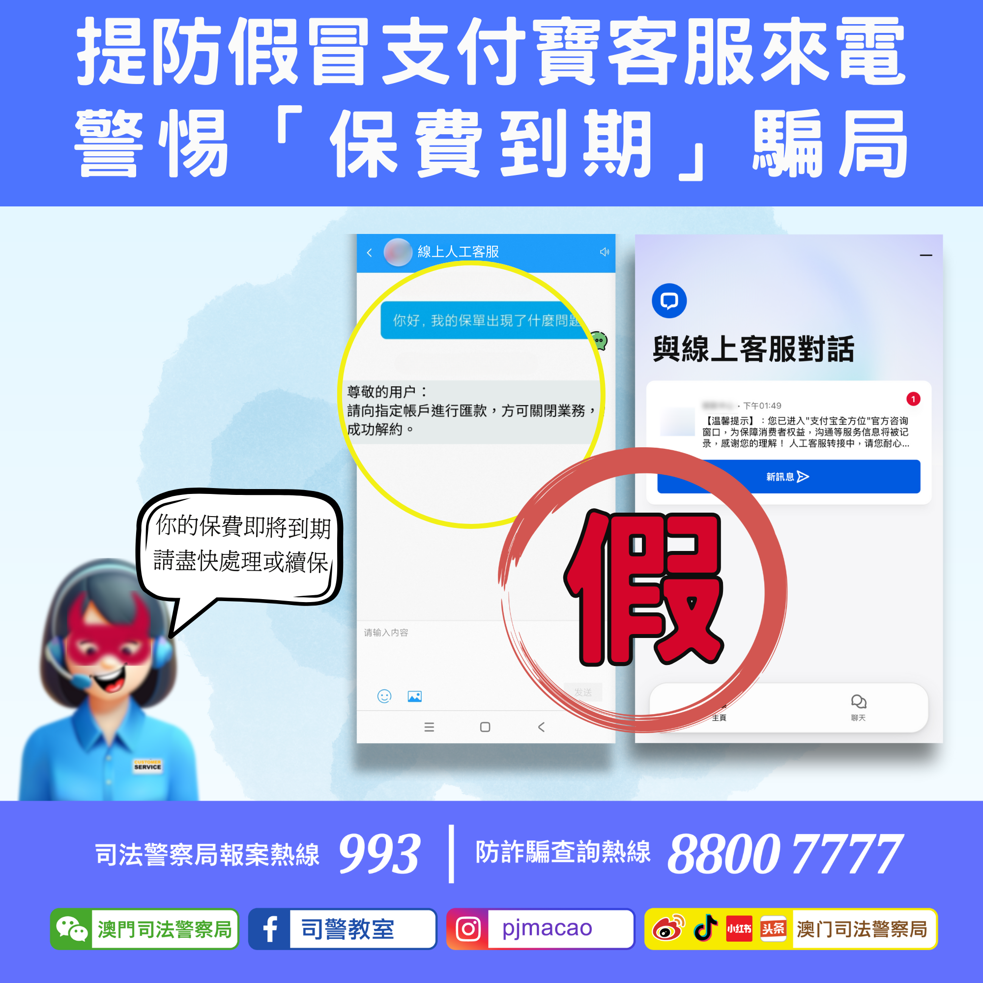 近日,司警局防詐騙查詢熱線接獲多名市民通報,稱收到冒充「支付寶客服人員」的來電。來電者以普通話表示,事主的帳戶早前已開通並購買了「資金安全保險計劃」,該保險計劃即將到期,並將自動續保及從帳戶中扣取大額保費。「客服人員」表示如需取消續保,事主必須按照指示登入一個所謂的金融機構網站,並與「線上人工客服」聯絡,並依指示進行轉帳操作,方能解除上述保險計劃。