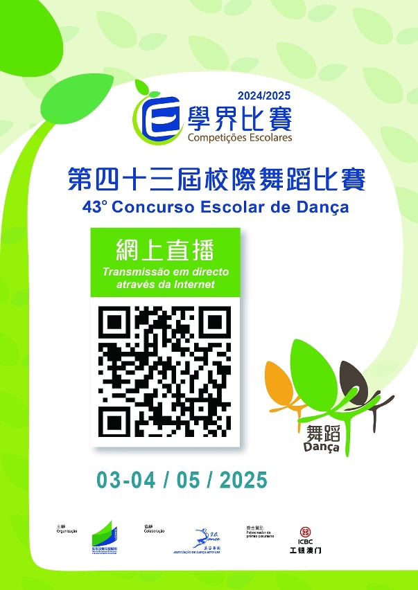 為鼓勵澳門舞蹈藝術的發展,促進各學校間的舞蹈文化交流,從而提高學界的舞蹈水平,使學生體會到相互合作的重要性,由教育及青年發展局主辦、英姿舞園協辦、中國工商銀行(澳門)股份有限公司獎金贊助的“第四十三屆校際舞蹈比賽”將於2025年5月3日及4日假澳門大學大學會堂舉行。
