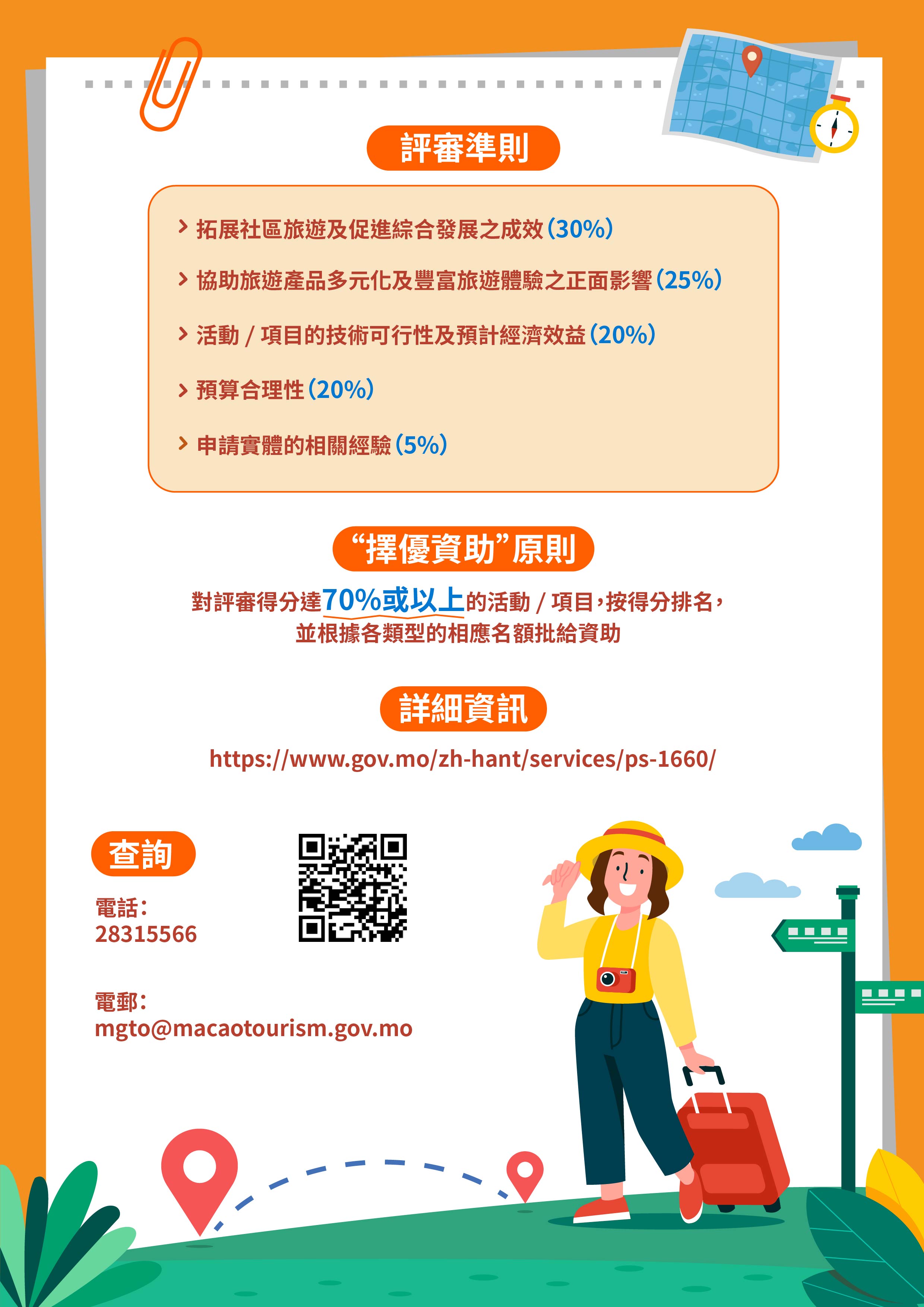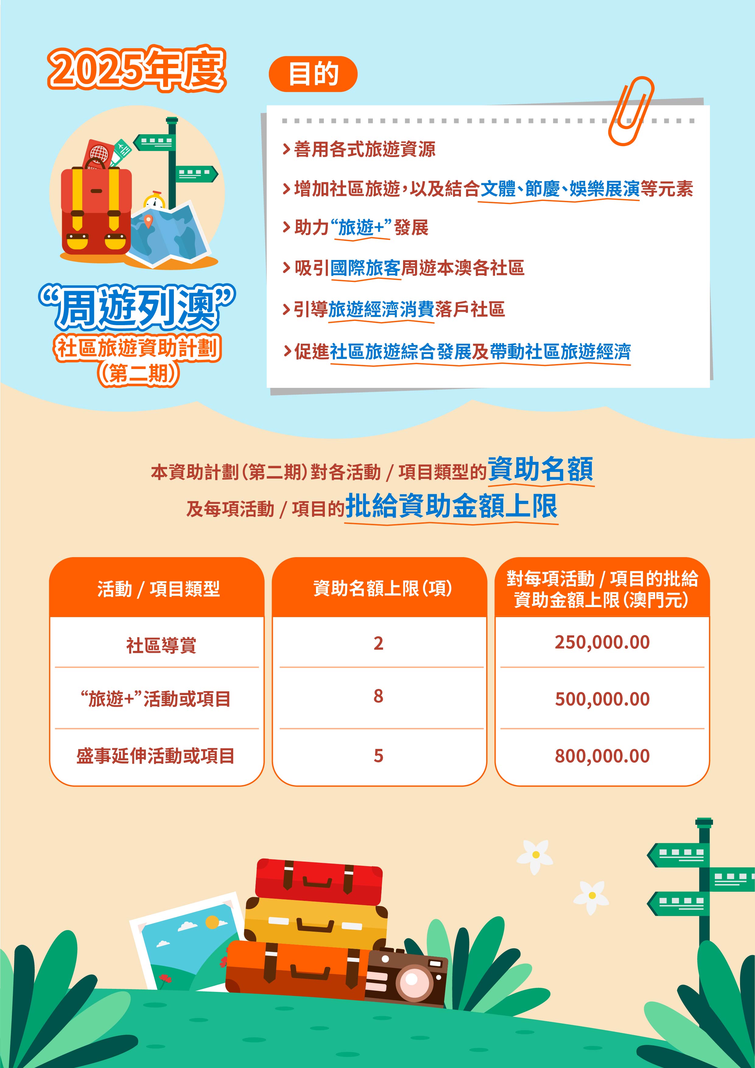 旅遊局2025年度“周遊列澳”社區旅遊資助計劃(第二期)於4月11日至25日接受申請,活動或項目須於2025年7月1日至12月31日期間舉辦,申請可透過商社通帳戶登入旅遊局“2025年度資助計劃”專頁提交。