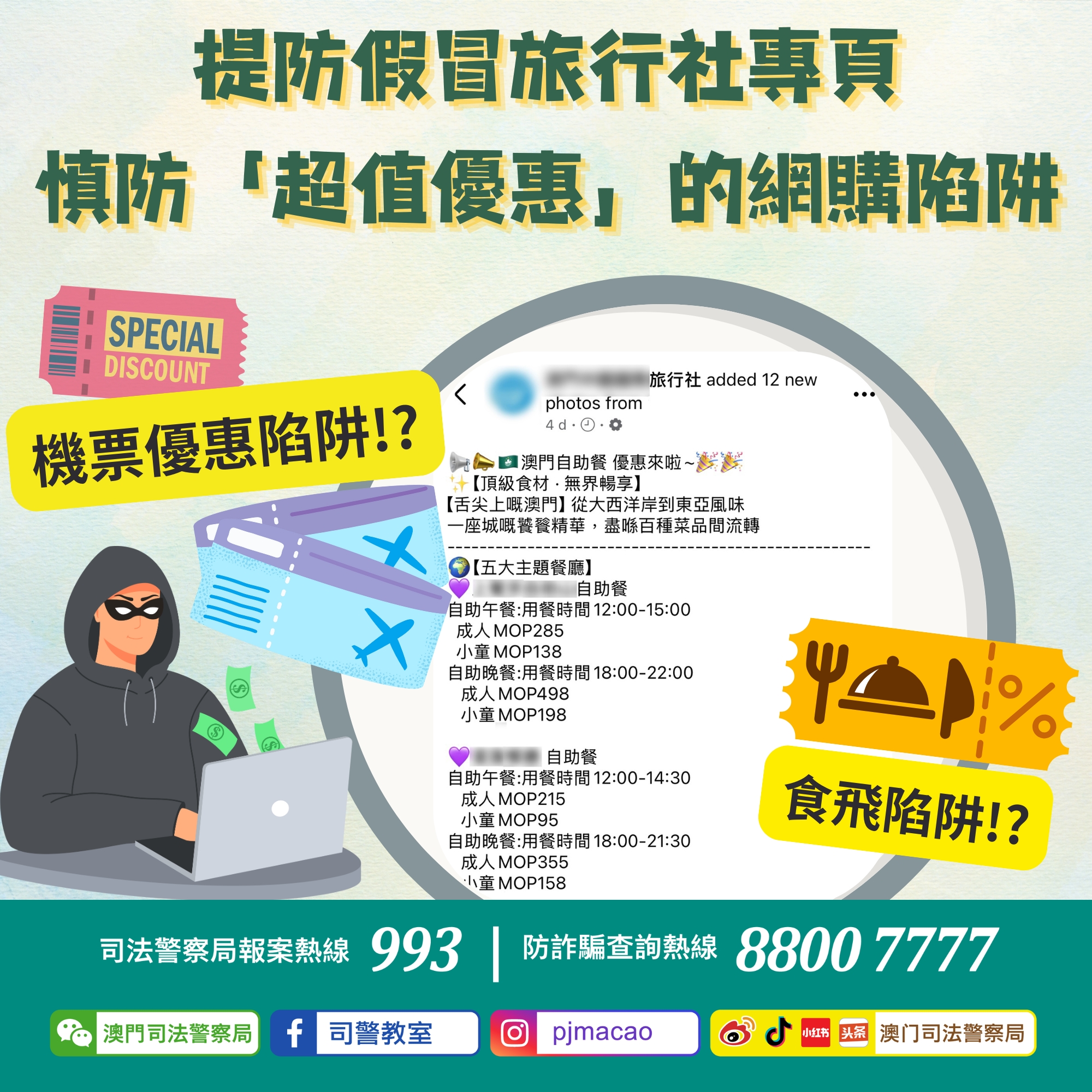近日,司法警察局接獲多宗有關「假冒旅行社」的詐騙舉報。騙徒利用網上社交平台,假冒本澳多間旅行社開設虛假專頁,並以廣告形式發佈帖文,聲稱出售「超值優惠」的機票或自助餐券,藉此誘騙有意購買的事主支付訂金或全額費用。當事主向專頁提供的銀行帳戶轉帳後,便被對方加入黑名單,始發現被騙。