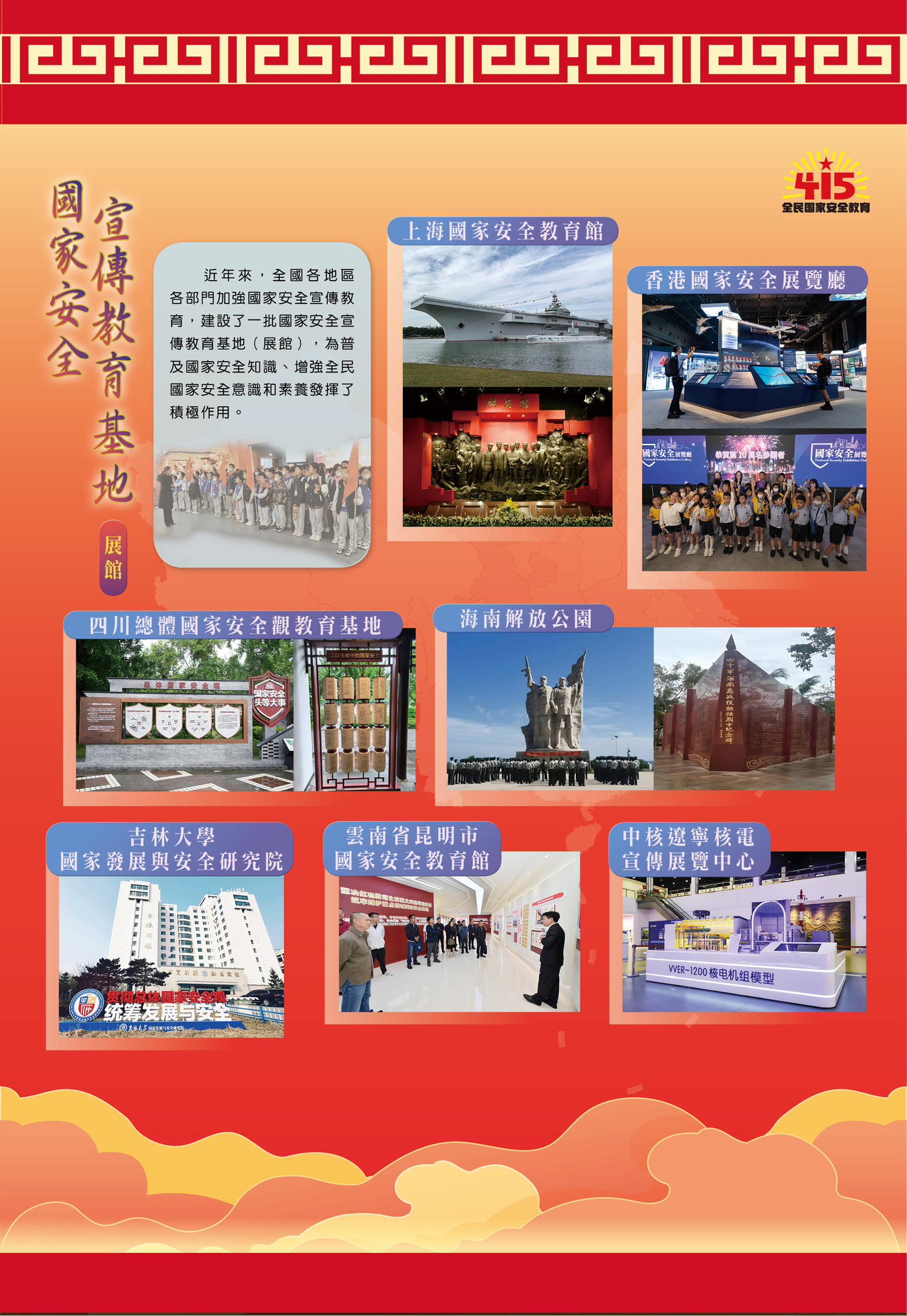 展覽第一部分“推陳出新,走深走實,掀起國安宣傳教育新熱潮”,展示了過去10年全面貫徹落實總體國家安全觀、我國國家安全工作取得歷史性成就。10年來,全國各地圍繞全民國家安全教育日活動主題,廣泛開展一系列國安宣教活動,推動“大安全”理念深入人心、落地生根。近年來,在上海、四川、海南及香港特區等地建設了一批國家安全宣傳教育基地(展館),為普及國家安全知識、增強全民國家安全意識發揮了積極作用。
