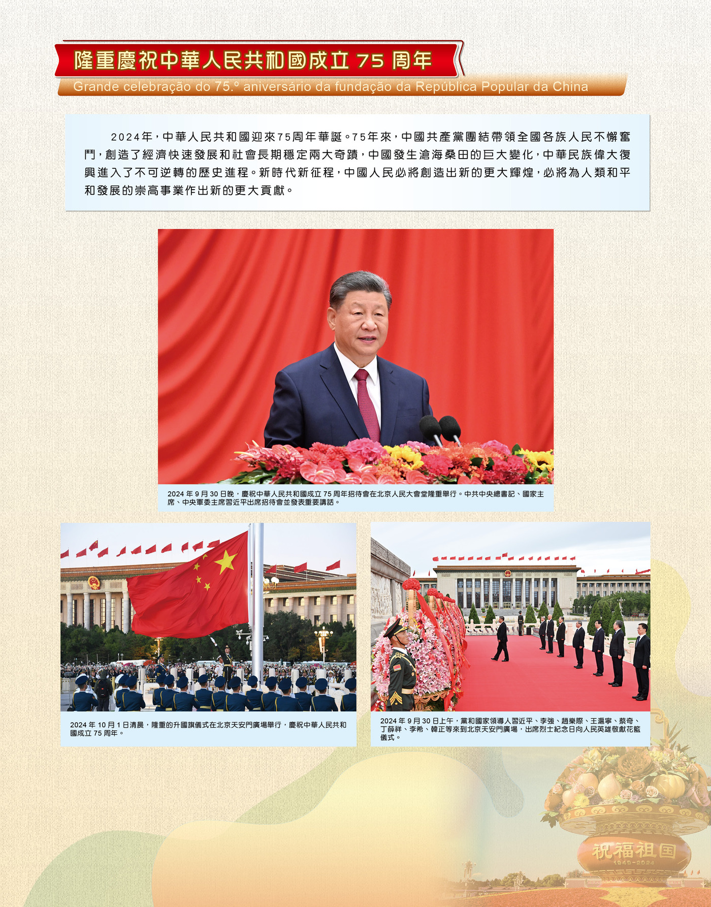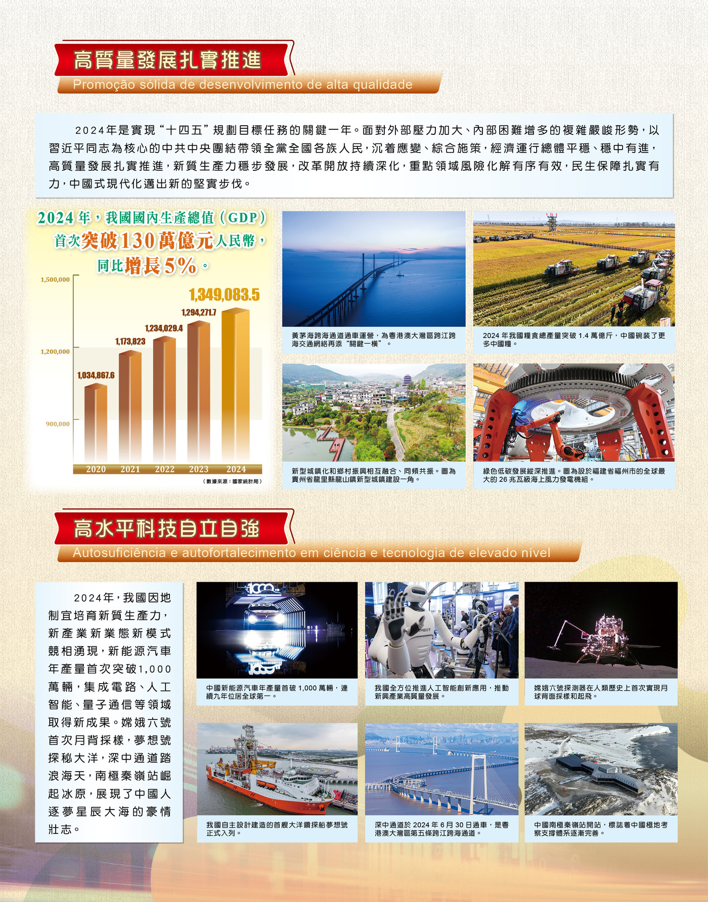 展覽在序章部分介紹了國家發展取得新的偉大成就。回顧2024年,隆重慶祝了中華人民共和國成立75周年,勝利召開中共二十屆三中全會,國家高質量發展扎實推進,高水平科技自立自強,人民群眾幸福生活多姿多彩,中國特色大國外交更有作為。