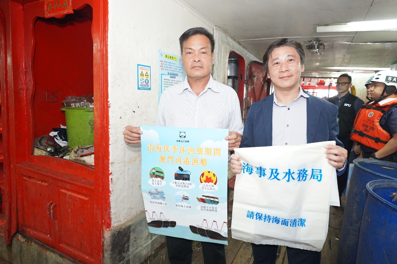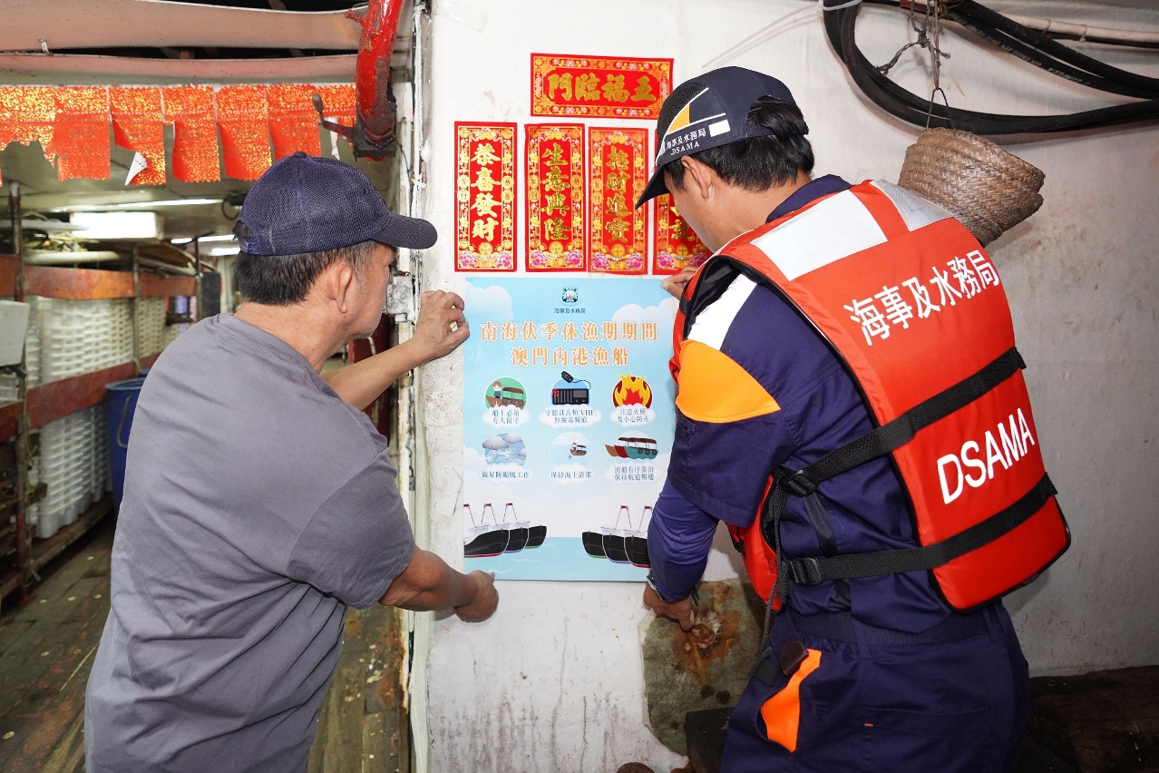 為期三個半月的南海休漁期,將於本年5月1日中午開始,至本年8月16日中午結束。隨着內港一帶錨泊的漁船數量增加,海事及水務局聯同警察總局、海關、消防局、市政署、衛生局以及漁民團體代表登船拜訪漁民,宣導休漁期期間防火、防風、防污、防盜和衛生等意識,呼籲漁民業界遵規守法,共同維護海上安全環境。