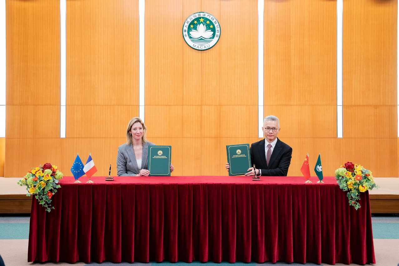 經濟財政司司長戴建業代表特區政府與法國政府代表法國駐香港總領事館總領事杜麗緹於5月8日在澳門簽署了《中華人民共和國澳門特別行政區政府和法蘭西共和國政府有關執行科研合作計劃的協議》。該協議旨在加強雙方在科研領域的交流與合作,促進科技創新和人才培養,是澳門著力打造更高水平對外開放平台的重要進展。外交公署副特派員孫向陽出席,以及高校、科技企業、法國及歐洲商會等機構代表近40人出席簽署儀式。