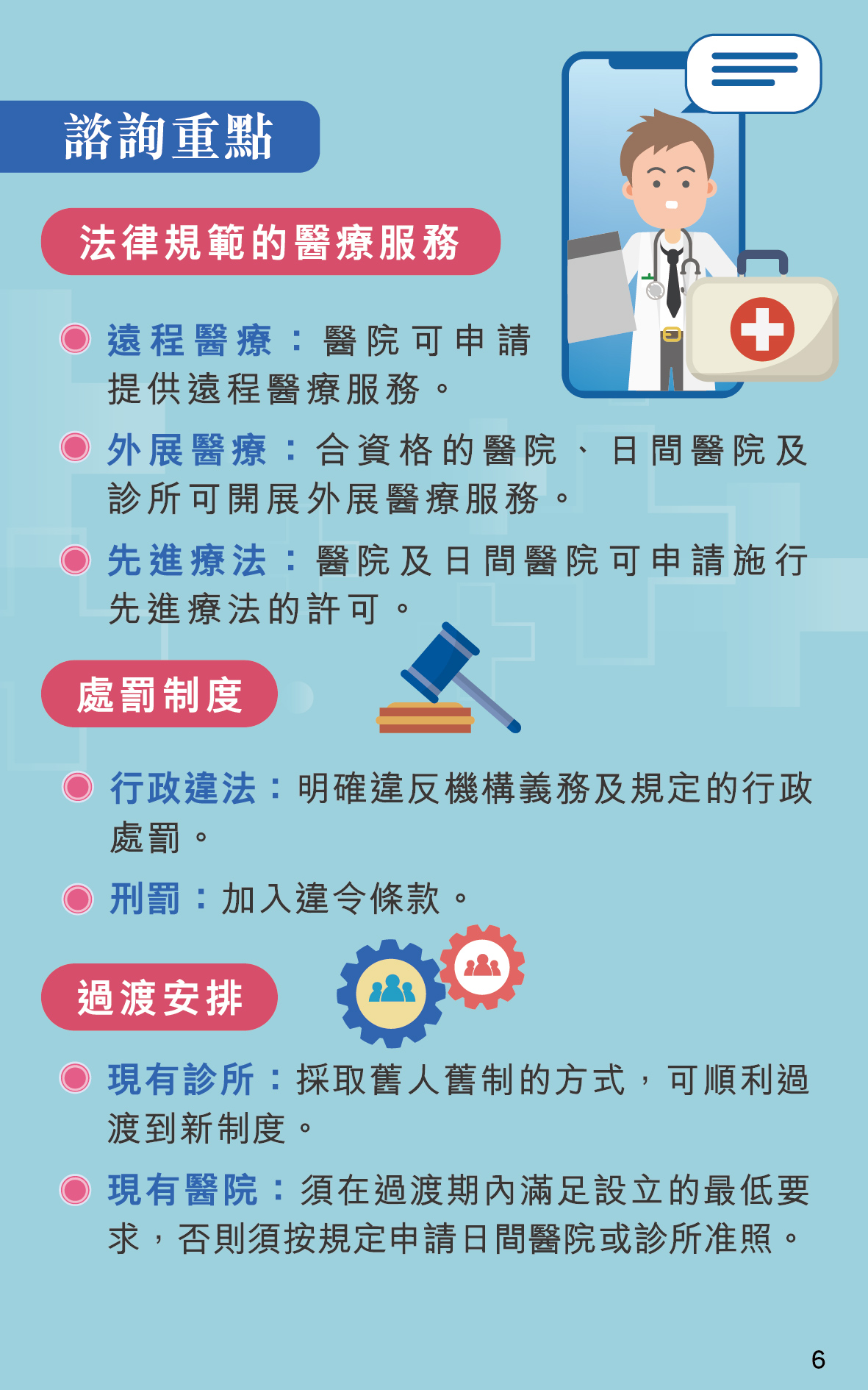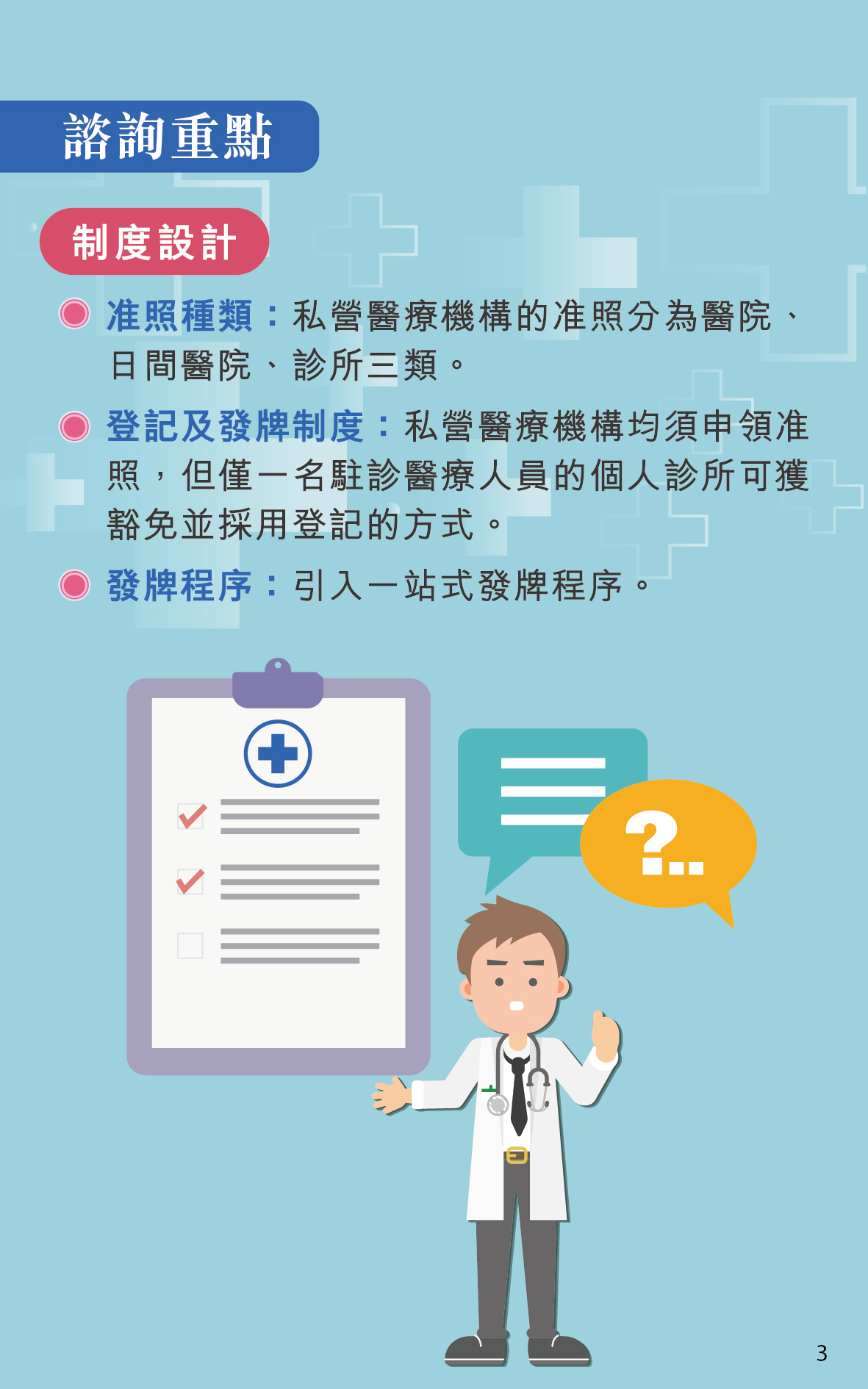 鄭成業副局長表示,特區政府計劃優化現行制度,進一步拓展本澳醫療市場的發展空間,為本澳醫療人員創造更多發展機會,向居民、旅客提供多元化和優質的醫療服務,在推動本澳大健康產業發展同時,也能有效地保障公眾健康。彭蓬光醫務主任則詳細介紹了《私營醫療機構業務法律制度》公開諮詢的主要內容,包括牌照制度設計、機構的開設及運作要求、法律規範的醫療服務、處罰制度及過渡安排等。