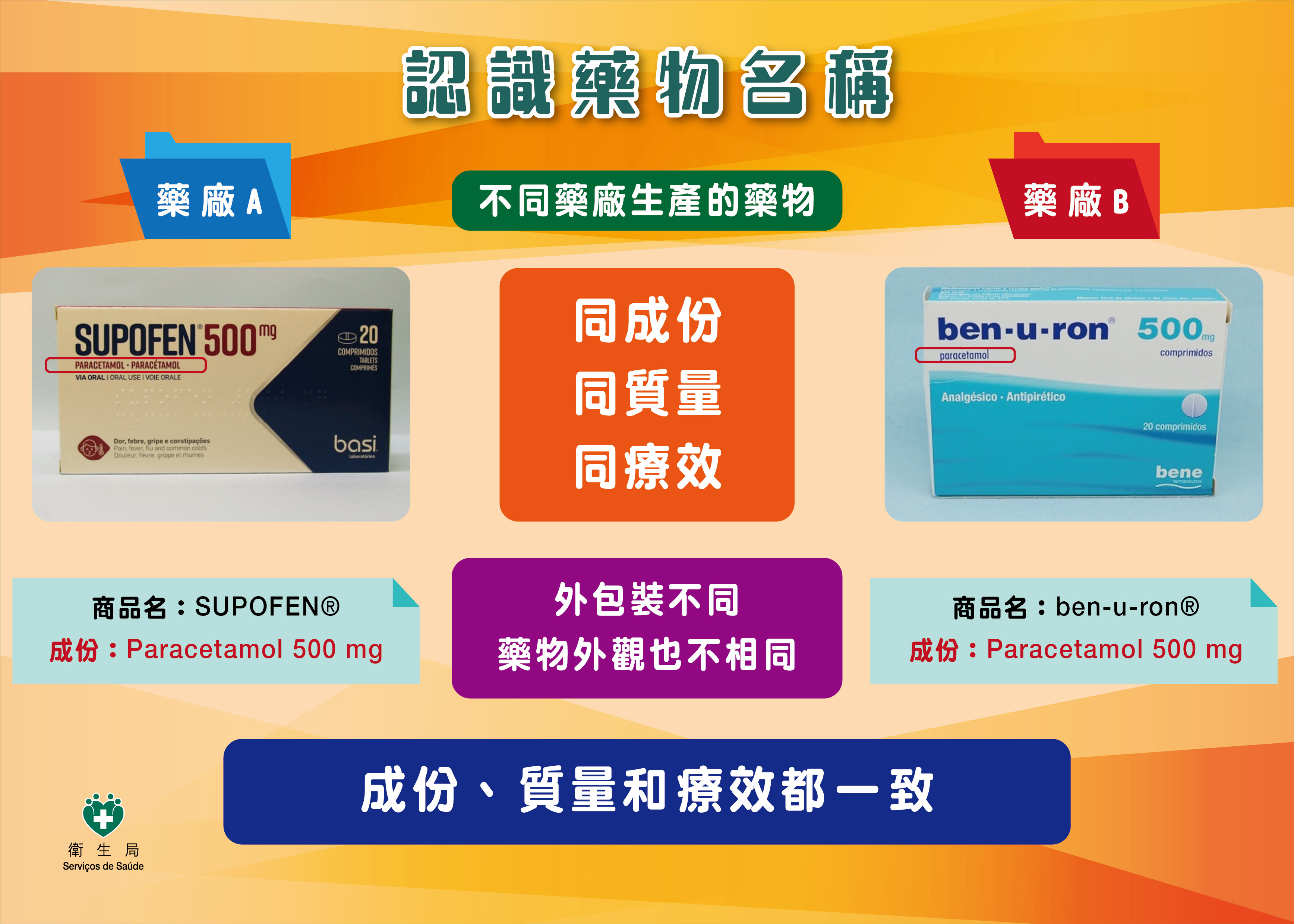 居民可透過“一戶通”→“我的健康”→“健康紀錄”→“服用中的藥物”→ 選擇醫生處方的藥物成份,能查看衛生局近年曾採購同成份但不同牌子的藥物,點選相應的藥物牌子即可查看藥物圖片、成份、劑型、劑量、常用適應症、副作用和如何服用等資料。此外,在轉換藥物牌子時,居民亦可透過此功能取得更多藥物資訊,即時比對新舊藥物資料,減少因外包裝差異產生的疑慮,加強個人健康管理。