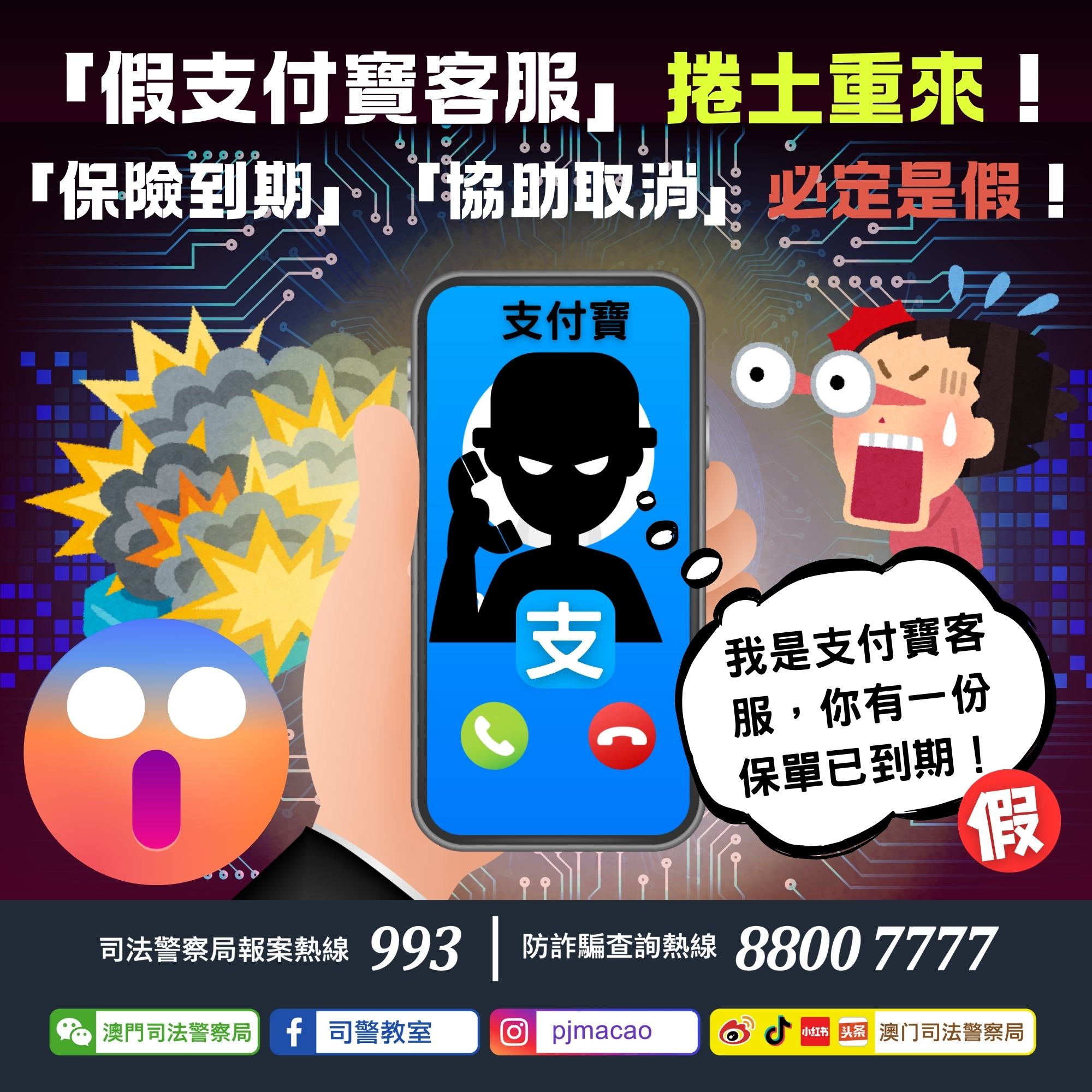 司法警察局昨日(5月12日)透過反詐程式及防詐騙查詢熱線,分別接獲至少36名市民舉報,報稱收到冒充「支付寶」客服的詐騙電話。騙徒在來電中聲稱事主支付寶內的「資金安全保」即將到期,若不取消將被收取高額費用。隨後,騙徒再冒充其他金融機構的「客服」聯絡事主,訛稱協助取消保險手續,趁機詐騙金錢。