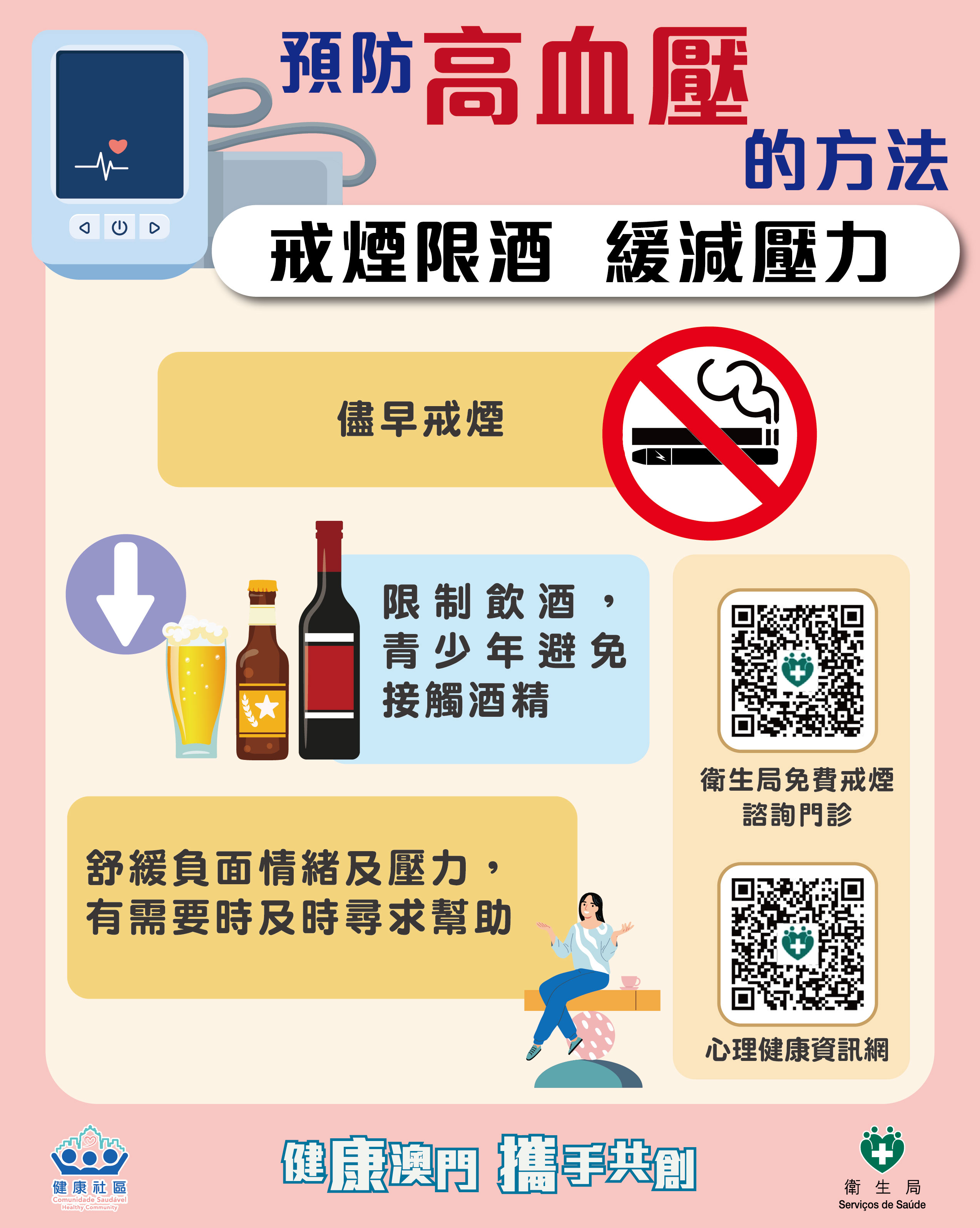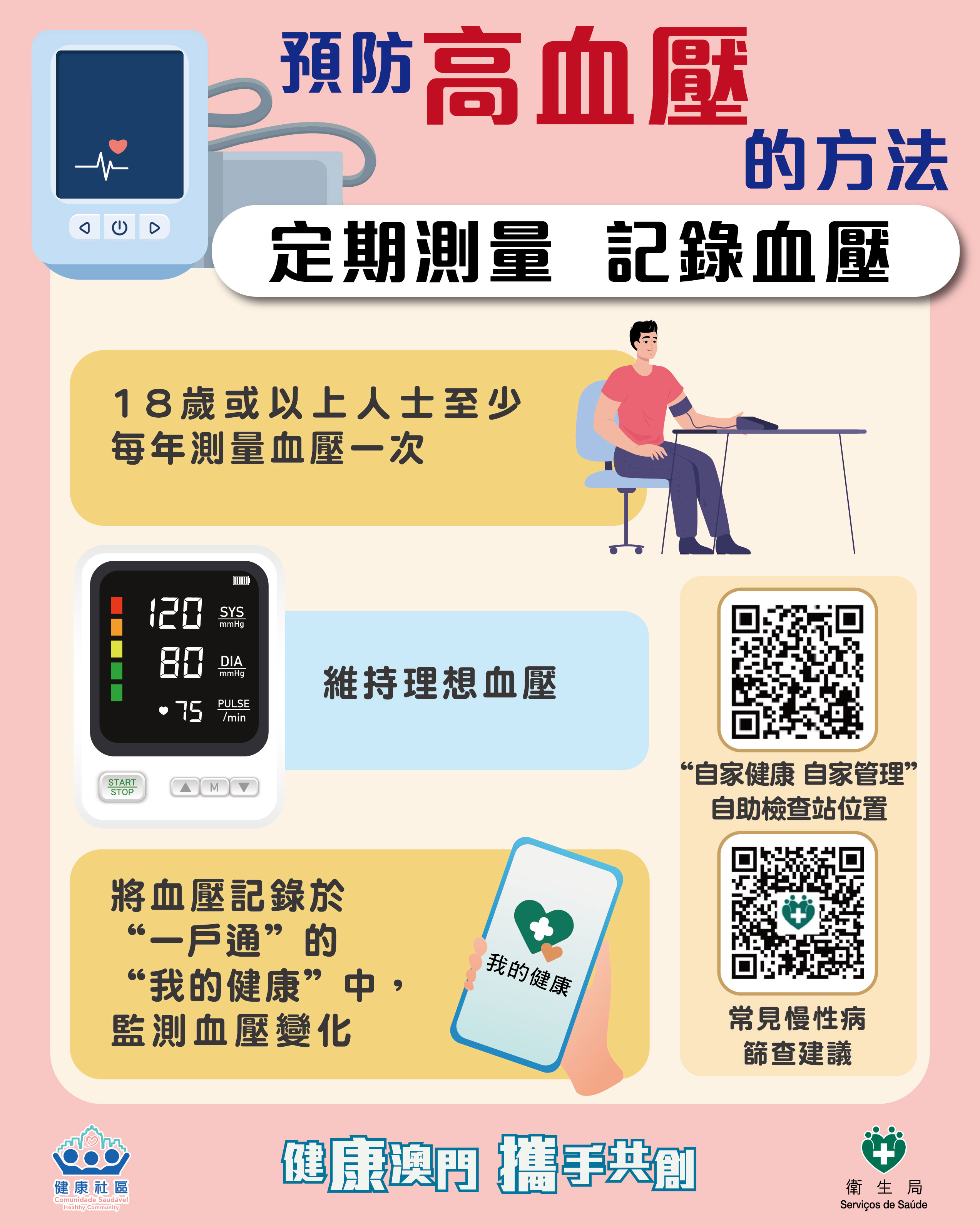 今年“世界高血壓日”期間(5月15至21日),衛生局舉辦社區推廣活動,活動分機構和個人兩個參與層面(詳情參閱“5.17血壓齊齊Check”海報)。2024年該活動吸引逾12,000人次參與,反響熱烈。衛生局表示,將持續優化慢性病防控策略,擴大管理覆蓋面,從源頭推動居民養成健康習慣,共同落實“全生命周期健康保障”的國家戰略目標,與居民攜手共建健康社區和幸福澳門。