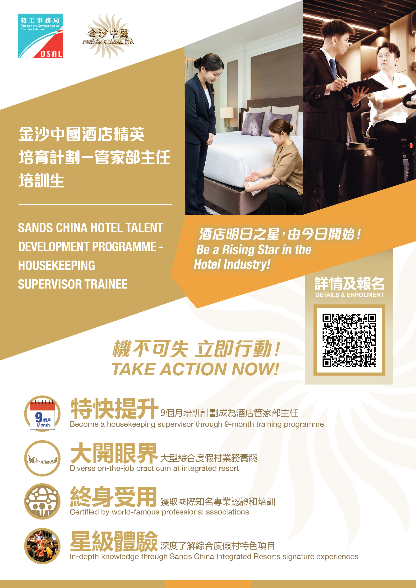 為培養本澳居民成為綜合度假村酒店從業員,拓展多元職涯路向,勞工事務局(下稱勞工局)和金沙中國有限公司(下稱金沙中國)合作推出“金沙中國酒店精英培育計劃"(下稱計劃),以先入職、後培訓方式,為有志投身綜合旅遊休閒服務行業的澳門居民,提供專業及多元實操培訓與事業發展機會,計劃由5月23日起接受申請。