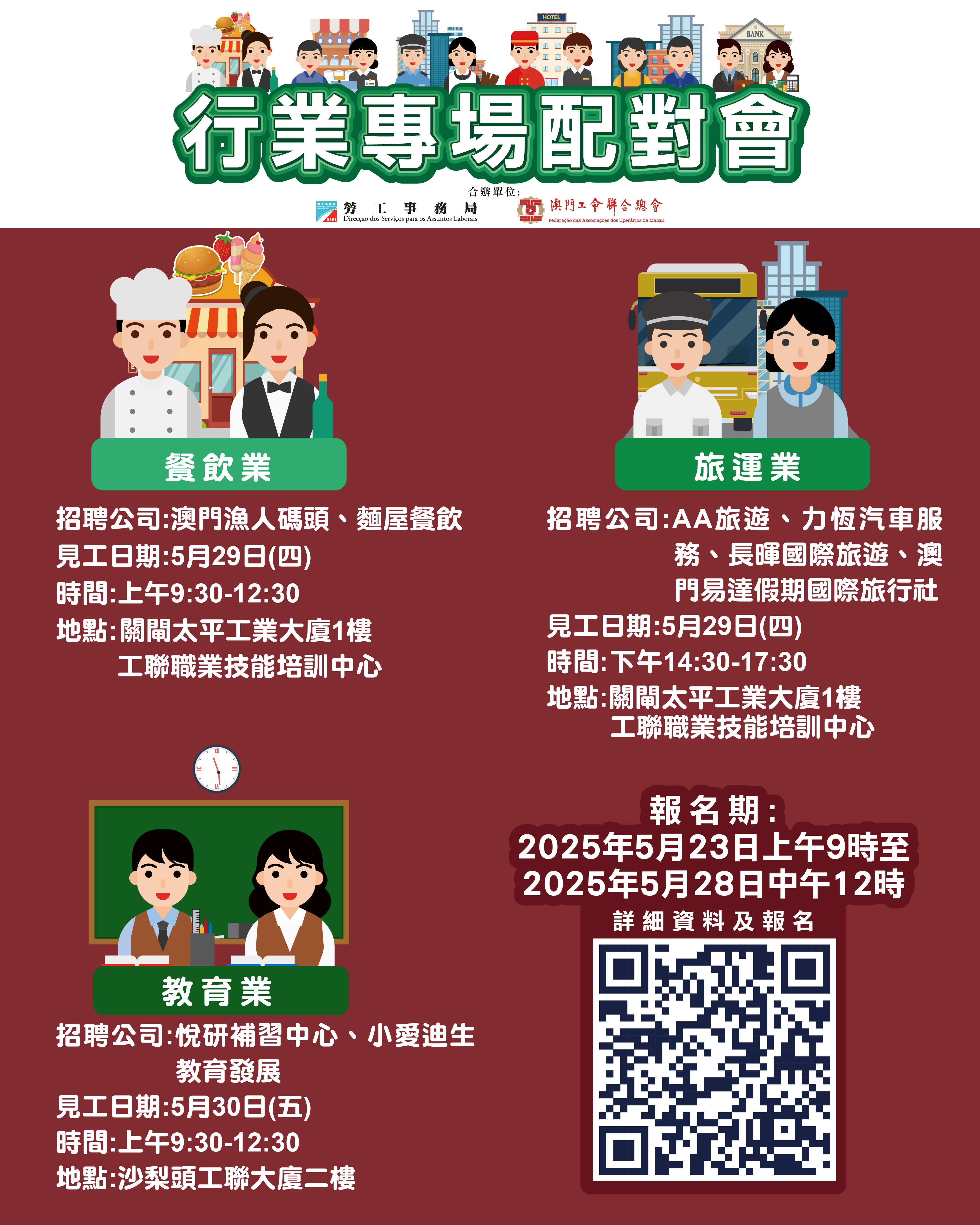 5月29日上午餐飲業專場配對會及同日下午旅運業專場配對會在澳門工聯職業技能培訓中心(關閘馬路101-105A號太平工業大廈第一期1樓)舉行;5月30日上午教育業專場配對會在澳門工會聯合總會二樓(澳門沙梨頭海邊街2-6號工聯大廈)舉行。報名日期為5月23日上午9時至5月28日中午12時。
