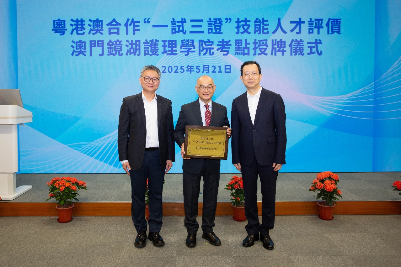 為持續深化粵澳在勞動範疇方面的合作,日前(21日)廣東省人力資源和社會保障廳(簡稱廣東省人社廳)杜敏琪廳長一行赴澳調研,期間拜訪勞工事務局,雙方就鞏固和開拓合作交流意見,並共同為澳門鏡湖護理學院授牌成為本澳首個粵港澳合作“一試三證”技能人才評價考點,為本澳居民考取粵港澳三地認可技能證明提供便利。