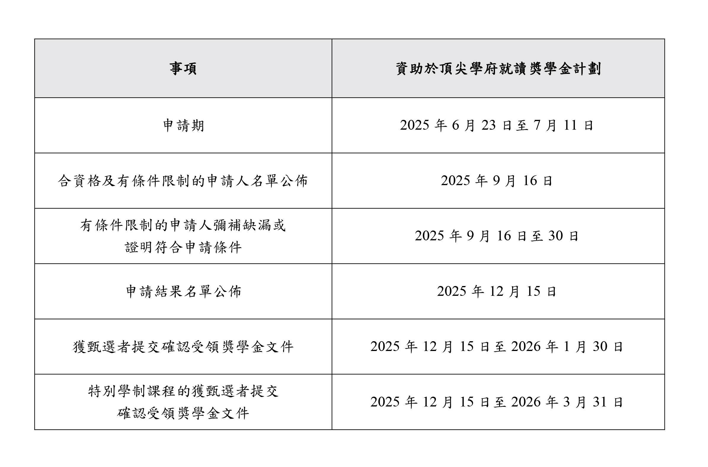 “資助於頂尖學府就讀獎學金計劃”申請期為6月23日至7月11日,資助對象為修讀學士學位課程、學碩連讀/學碩博連讀學位課程的學士學習階段申請人。同時,申請人升讀的課程須為2025年《泰晤士高等教育世界大學排名》公佈的各學科領域名列前50位,或經教育基金行政管理委員會接受的其他具公信力之世界大學專業排名中名列前10位。