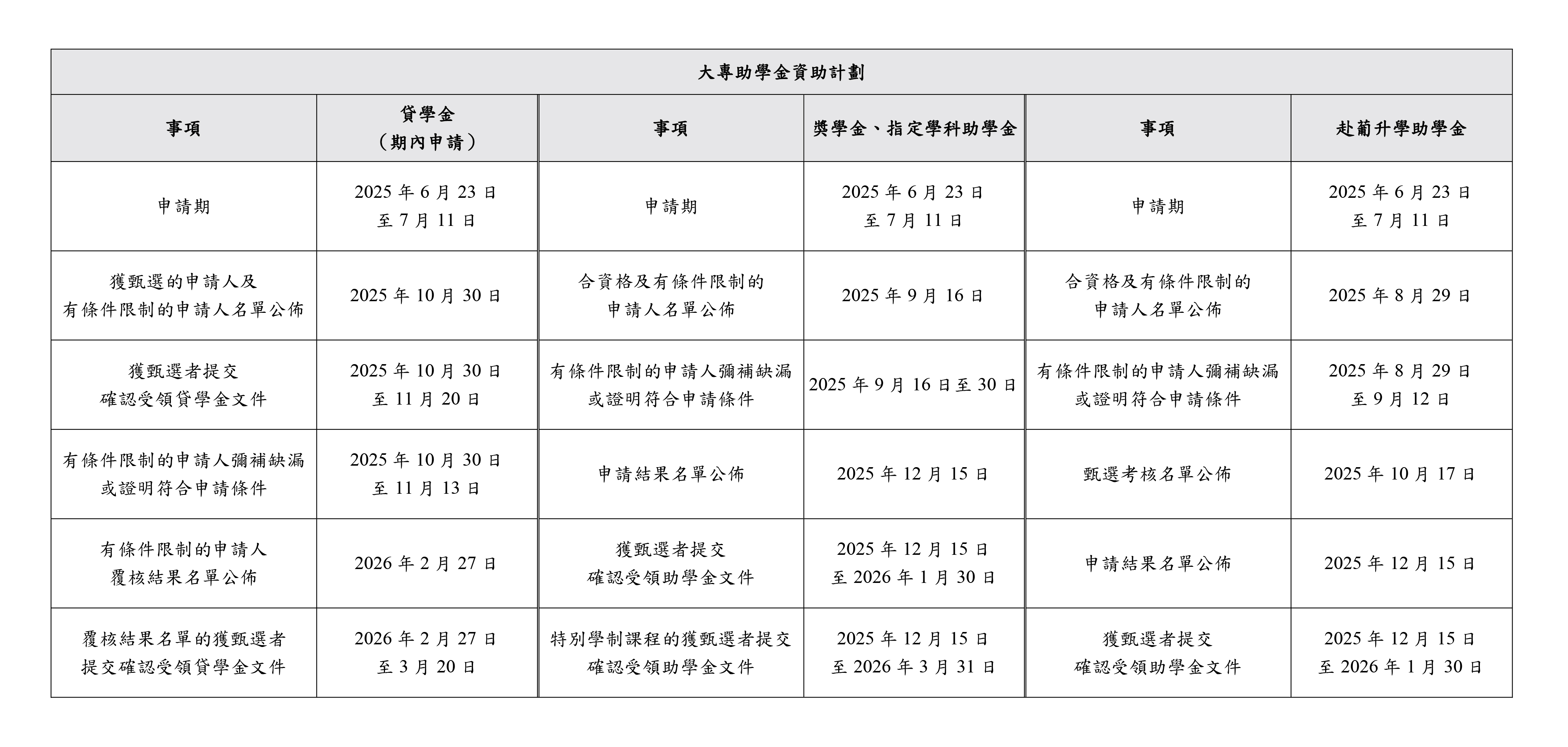 更多詳情,請瀏覽大專獎助學金專頁:https://portal.dsedj.gov.mo/webdsejspace/internet/Inter_main_page.jsp?id=78500&。