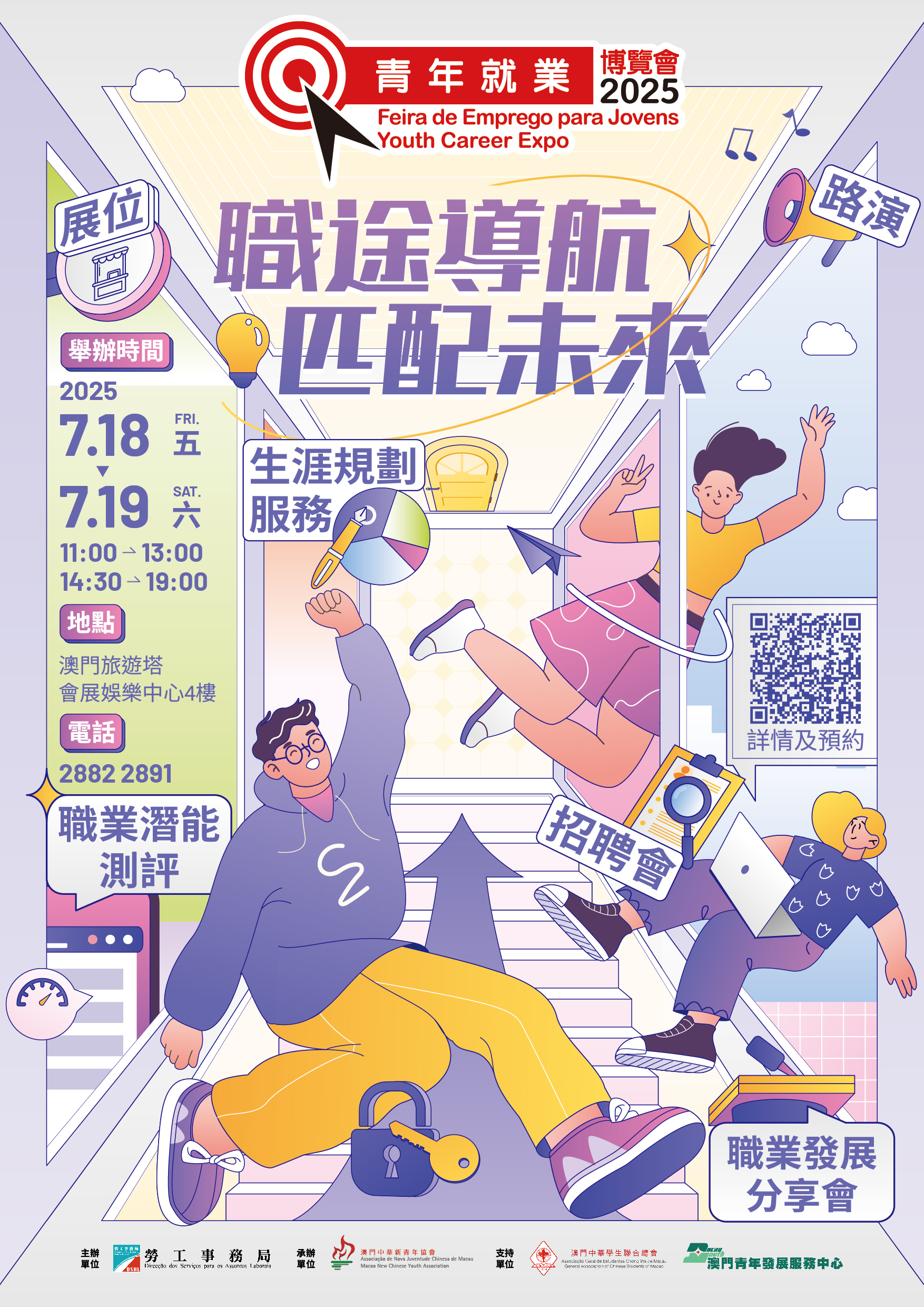 由勞工事務局主辦、澳門中華新青年協會承辦的 “青年就業博覽會2025”(下稱“青博”),將於2025年7月18日至19日假澳門旅遊塔會展娛樂中心4樓舉行,今年主題為 “職途導航,匹配未來”。青博前期即6月17日起,截至活動結束日為止,將推出線上“霍蘭德職業適應性測驗”,歡迎求職青年利用線上測評服務,並結合線下諮詢服務,了解自身與應徵崗位的匹配度。