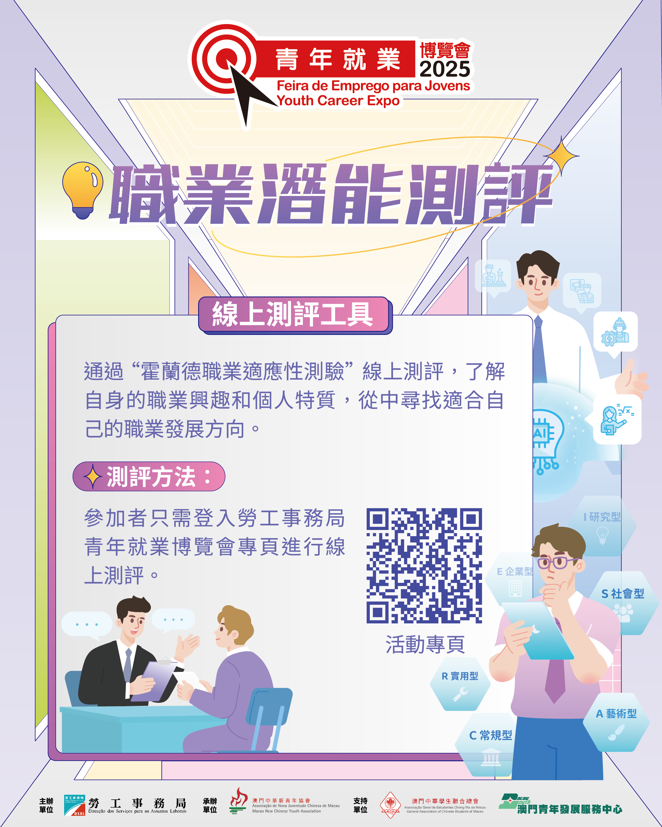 有意參與測評的青年,可登入勞工事務局青年就業博覽會專頁(https://www.dsal.gov.mo/zh_tw/standard/youthcareerexpo2025.html)進行線上測評。如需查詢,可於辦公時間致電2882 2891,與澳門中華新青年協會李小姐或馬小姐聯絡。