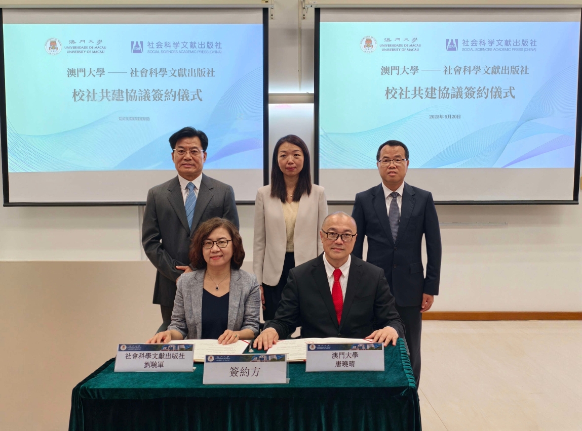 期間,在中央人民政府駐澳門特別行政區聯絡辦公室法律工作部副部長黃文軍、澳門特別行政區政府法務局局長梁穎妍和社會科學文獻出版社社長冀祥徳的共同見證下,澳門大學法學院院長唐曉晴與社會科學文獻出版社法治分社總編輯劉驍軍,分別代表澳門大學和社會科學文獻出版社簽署合作協議。
