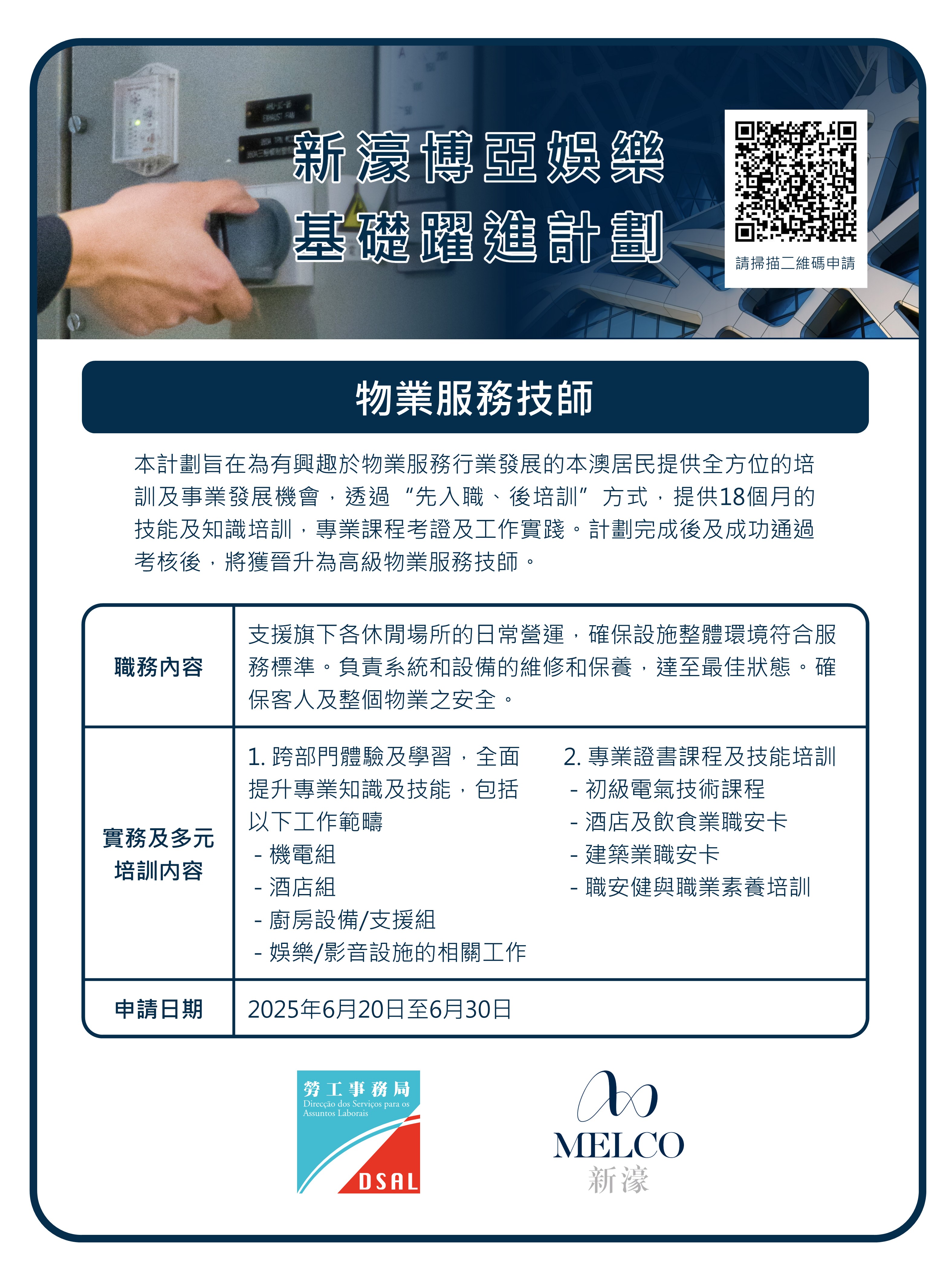 計劃提供“物業服務技師”職缺8個。獲錄取參加計劃者,新濠博亞將安排18個月的專業培訓及工作實踐。培訓內容包括在機電、設備及影音設施等部門體驗及學習、初級電氣技術課程、職安健與職業素養培訓,以及考取建築業職安卡和酒店及飲食業職安卡等。