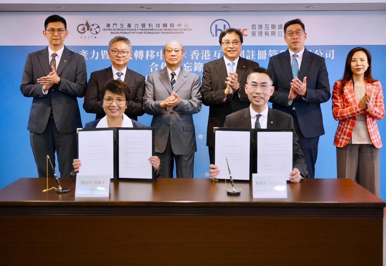 合作備忘錄由澳門生產力暨科技轉移中心理事長關治平、香港互聯網註冊管理有限公司行政總裁黃家偉共同簽署,在澳門生產力暨科技轉移中心社員大會主席徐偉坤、澳門特別行政區政府勞工事務局局長陳元童、經濟及科技發展局副局長陳祖榮、郵電局副局長葉頌華、香港特別行政區政府數字政策辦公室副數字政策專員(數字基建)張宜偉、香港互聯網註冊管理有限公司主席陳細明的見證下完成,標誌著雙方首次正式展開合作,為港澳兩地在網絡安全領域的協同發展奠定了堅實基礎。