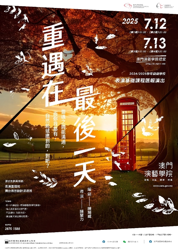 文化局轄下澳門演藝學院戲劇學校將於2025年7月12日及13日下午3點及晚上8點,在澳門演藝學院禮堂(高士德大馬路14-16號)舉行共4場2024/2025學年表演基礎課程匯演《重遇在最後一天》,門票由6月26日上午10時起於“一戶通”接受登記,或親臨戲劇學校登記領取,費用全免。