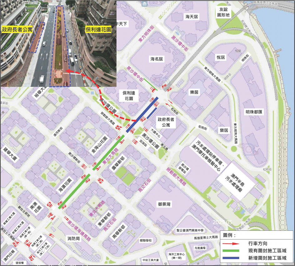 為配合東北大馬路空中走廊建造工程的主橋結構施工,東北大馬路將於7月1日起新增圍封介乎黑沙環中街與勞動節大馬路之間的中間綠化帶及長者公寓外圍部分行人路,並實施有限度通車(詳見附圖),期間東北大馬路將維持至少兩線行車且不影響現有巴士站運作。