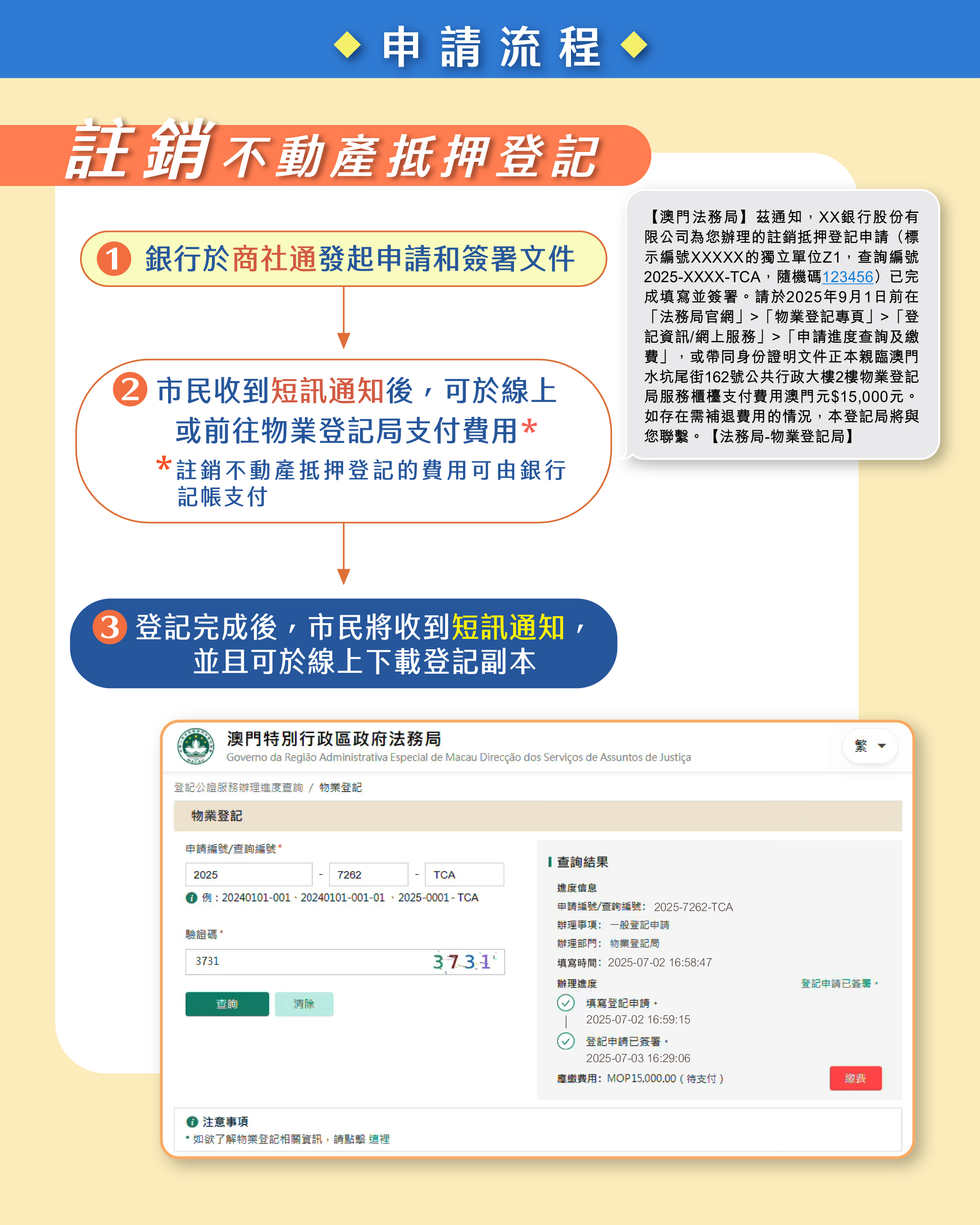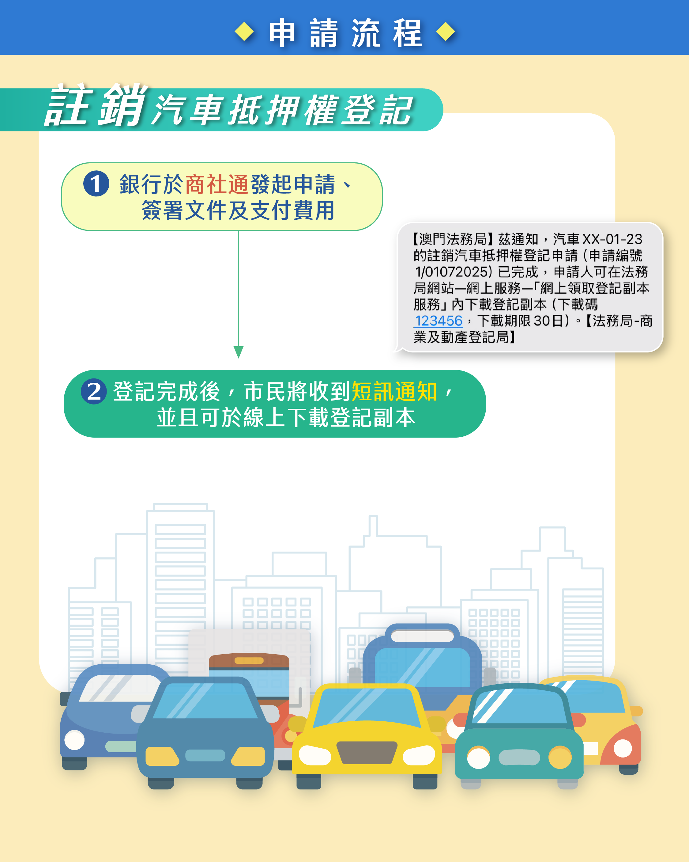 物業及動產登記方面,推出註銷不動產及汽車的抵押登記全程電子化服務,徹底改變沿用多年的作業模式。現時辦理註銷不動產及汽車的抵押登記手續,需要到公證部門及物業登記局辦理,兩者均需申請人親臨部門提出申請,待銀行代表簽署註銷抵押公證文件後,再前往繳付費用及領取登記副本。是次推出的全程電子化服務,市民毋須為辦理有關服務提交任何申請或文件,銀行(抵押權人)直接透過“商社通”於線上完成放棄抵押權聲明、提交登記申請及取得登記副本,市民可省時省心,同時亦減省銀行的行政手續,提供最大程度的便利。