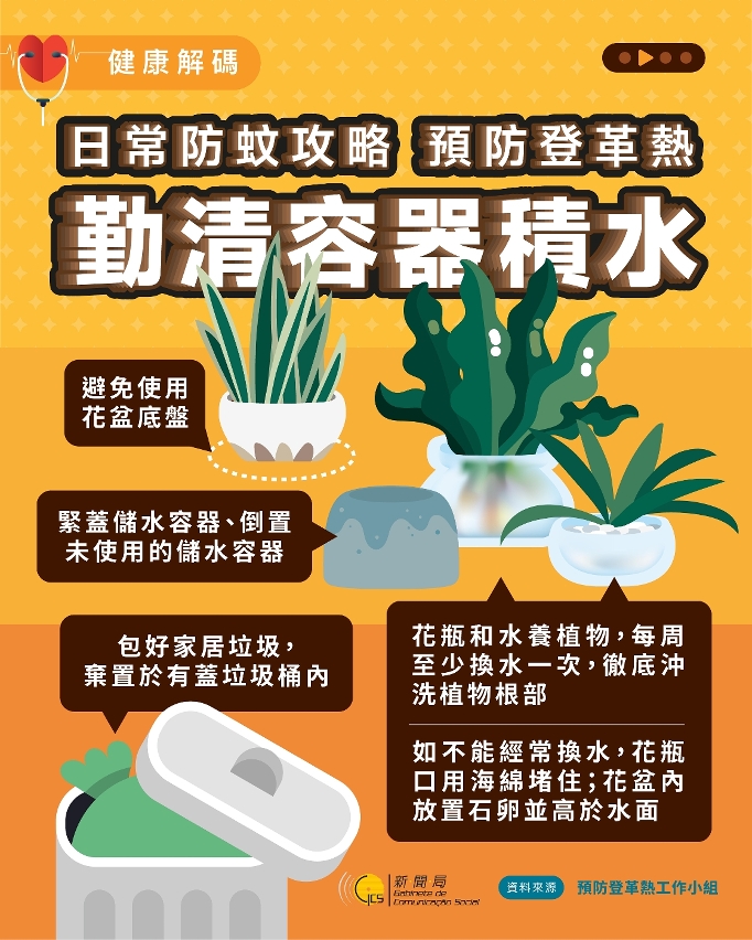 4. 不論是否有外遊史,若有發熱、出疹等疑似登革熱症狀,應及時就醫,並告知醫生有關的居住地點或旅遊史;