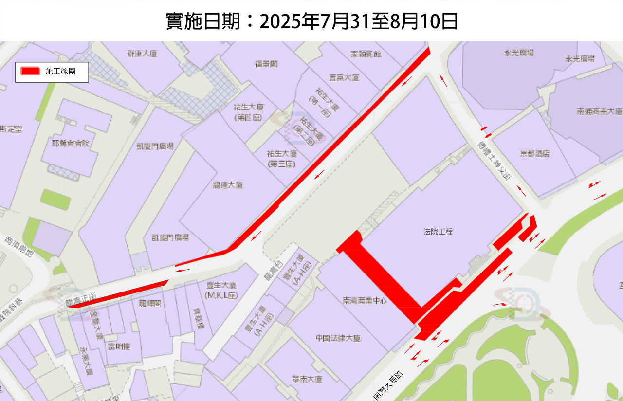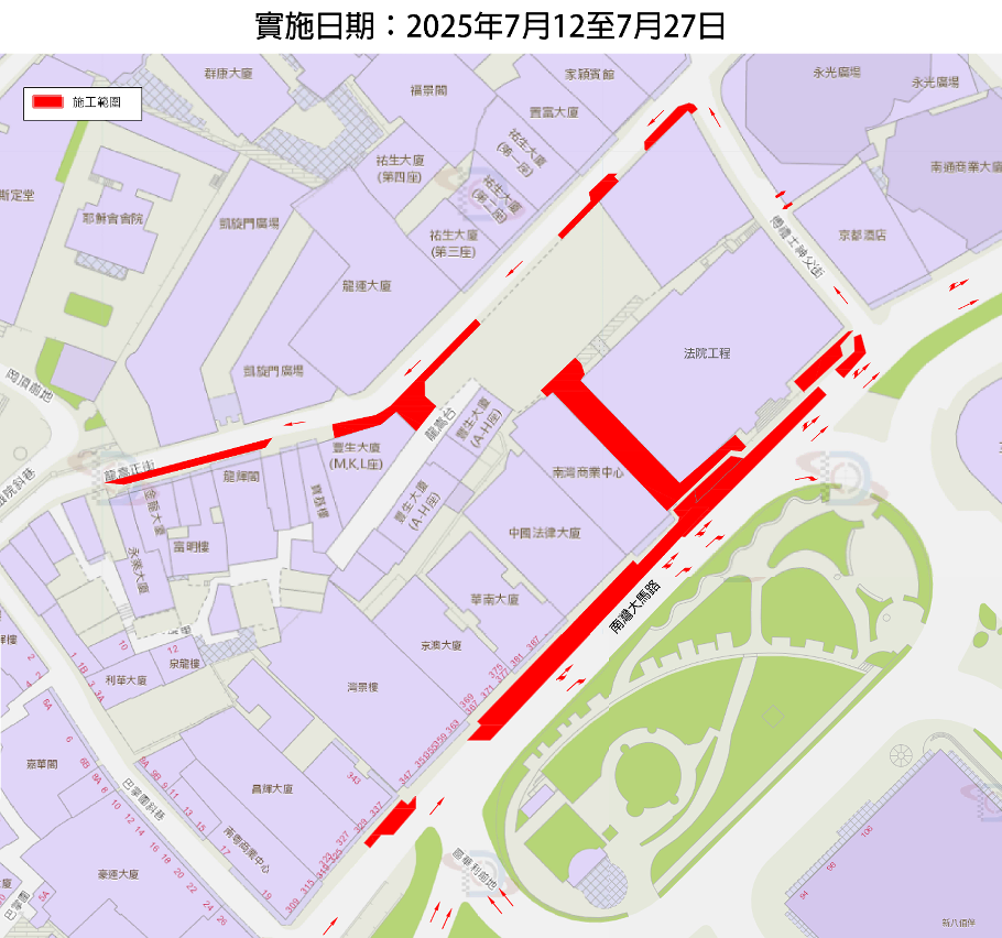 南灣大馬路法院大樓工程的管線接駁工作自本年6月16日起分階段有序推進,首階段涉及傅禮士神父街的施工預計可於7月12日按時完成,並於同日恢復正常通車。第二階段施工將於7月6日在南灣大馬路近京澳中心的一段先行開展,及後7月12日至8月10日在龍嵩正街和近互助會大廈的一段南灣大馬路開展,期間並會實施臨時交通措施,敬請市民留意及提早規劃出行安排。