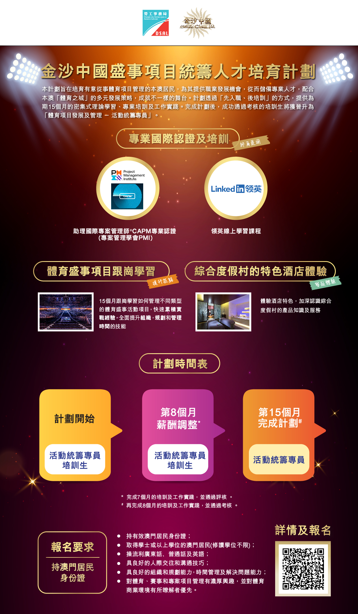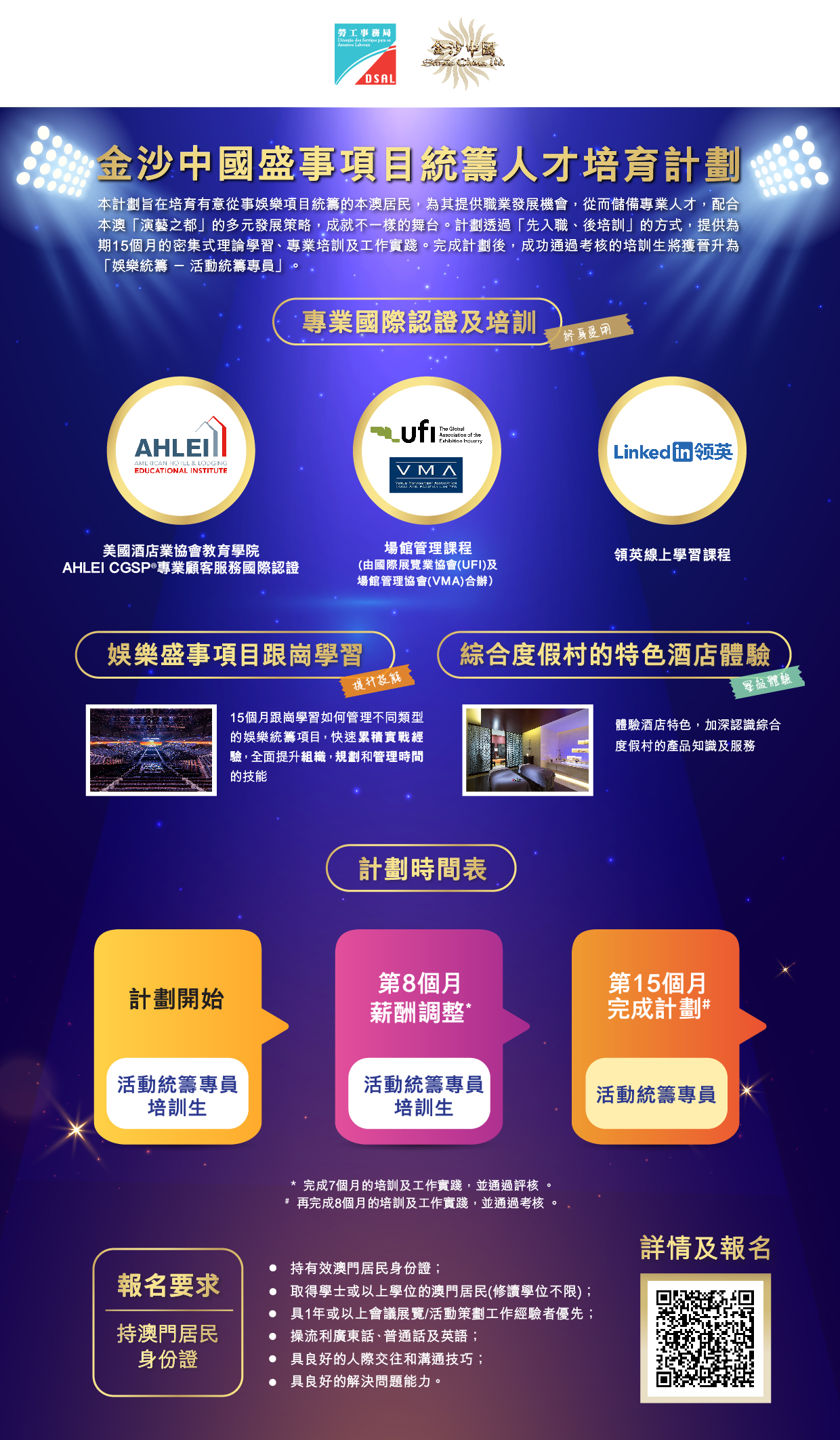計劃提供娛樂統籌—活動統籌專員培訓生職缺4個、體育項目發展及管理—活動統籌專員培訓生職缺4個,合共8個職缺。獲錄取參加計劃者,金沙中國將安排15個月的專業培訓及工作實踐。培訓內容包括綜合度假村跨部門學習、場館管理課程、商務禮儀禮賓及活動策劃證書課程,以及考取AHLEI CGSP®專業顧客服務國際認證、助理國際專案管理師專業認證等。