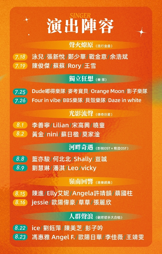 後續場次更是驚喜升級,將有香港人氣歌手許靖韻帶來港樂金曲;8月23日閉幕更將迎來「鐵肺女王」李佳薇與「新生代原創音樂人」王靖雯
