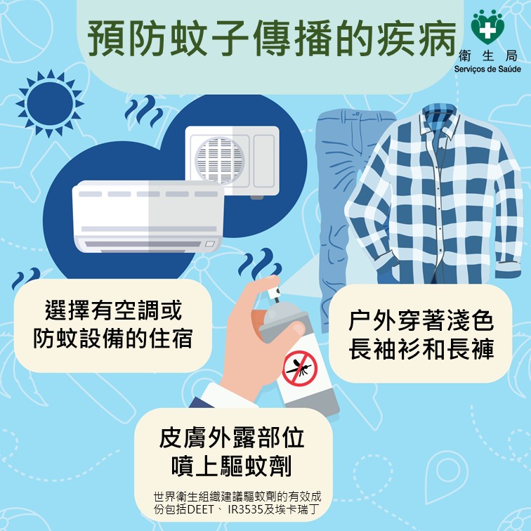 居民如前往熱帶地區戶外或郊區活動時,應加強防蚊措施。建議穿著淺色長袖衣物和長褲,並在裸露的皮膚上使用有效的驅蚊劑,以降低被蚊子叮咬的風險。