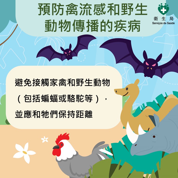 切勿靠近、餵飼和接觸禽鳥或野生動物,保持安全距離。若不慎被動物咬傷或抓傷,應立即在當地尋求醫療協助,及時處理傷口以降低感染風險。
