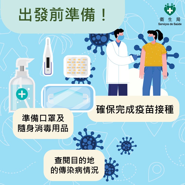 隨着暑假來臨,許多居民計劃外遊或出外探親。為確保旅途安全,讓居民安心享受假期並保障個人及家人的健康,衛生局提醒居民於外遊前做好防範疾病的準備,建議在出發前先查閱目的地有關傳染病流行情況、旅行期間做好防蚊措施、注意個人及食物衛生等,以降低感染登革熱、呼吸道傳染病及胃腸道疾病的風險。