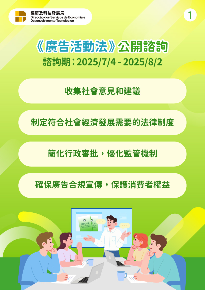 為更好地收集社會各界對修改《廣告活動法》的意見,經科局將於7月26日(星期六)下午3時至5時增設一場公眾諮詢會,歡迎市民透過專頁、掃描圖文包二維碼或辦公時間致電28575472或28575439報名。詳情可瀏覽公開諮詢專題網頁(https://www.dsedt.gov.mo/zh_MO/web/public/pg_alapc)。