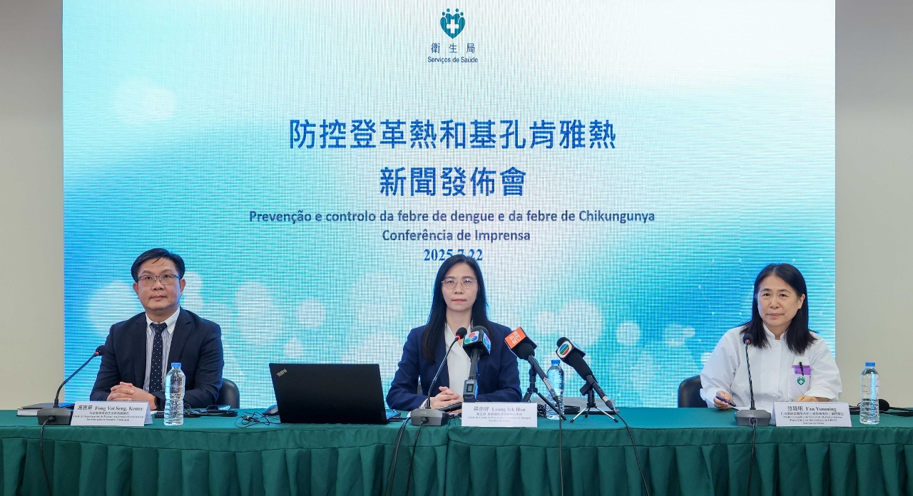 衛生局聯合市政署今(22)日舉行新聞發佈會,介紹登革熱和基孔肯雅熱的防控措施,旨在深化居民對此兩種疾病的認識,提升居民防範蚊媒傳播疾病意識並共同加強執行各項防蚊措施。衛生局疾病預防及控制中心梁亦好主任、市政署環境衛生及執照廳馮惠星廳長、衛生局仁伯爵綜合醫院內科(感染病專科)范韞明顧問醫生共同出席了新聞發佈會。