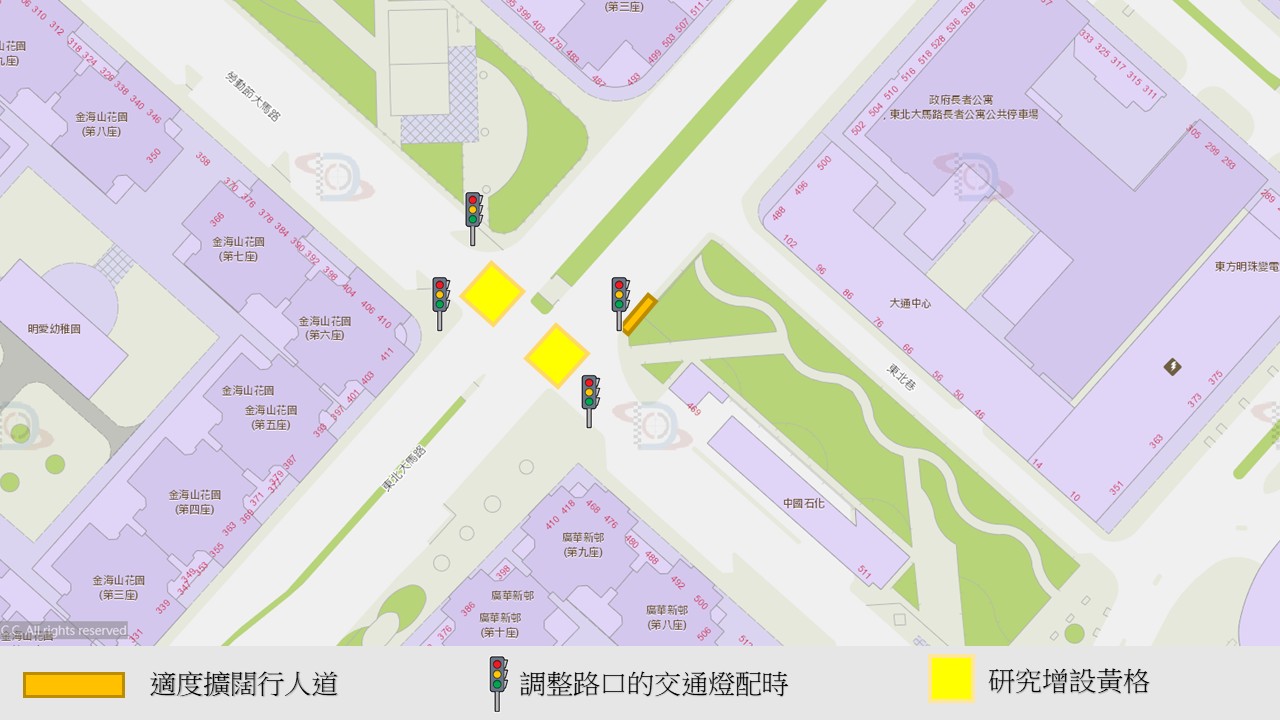 調整措施包括已適度擴闊長者公寓一側東北大馬路的行人道,改善行人通行環境;同時優化東北大馬路與勞動節大馬路交界的交通燈號設置,在原有臨時交通安排的基礎上延長行人過路時間,確保長者及有需要人士通行安全。此外,交通事務局正研究在東北大馬路與勞動節大馬路交界處增設黃格標記的可行性,以完善該區的交通狀況。
