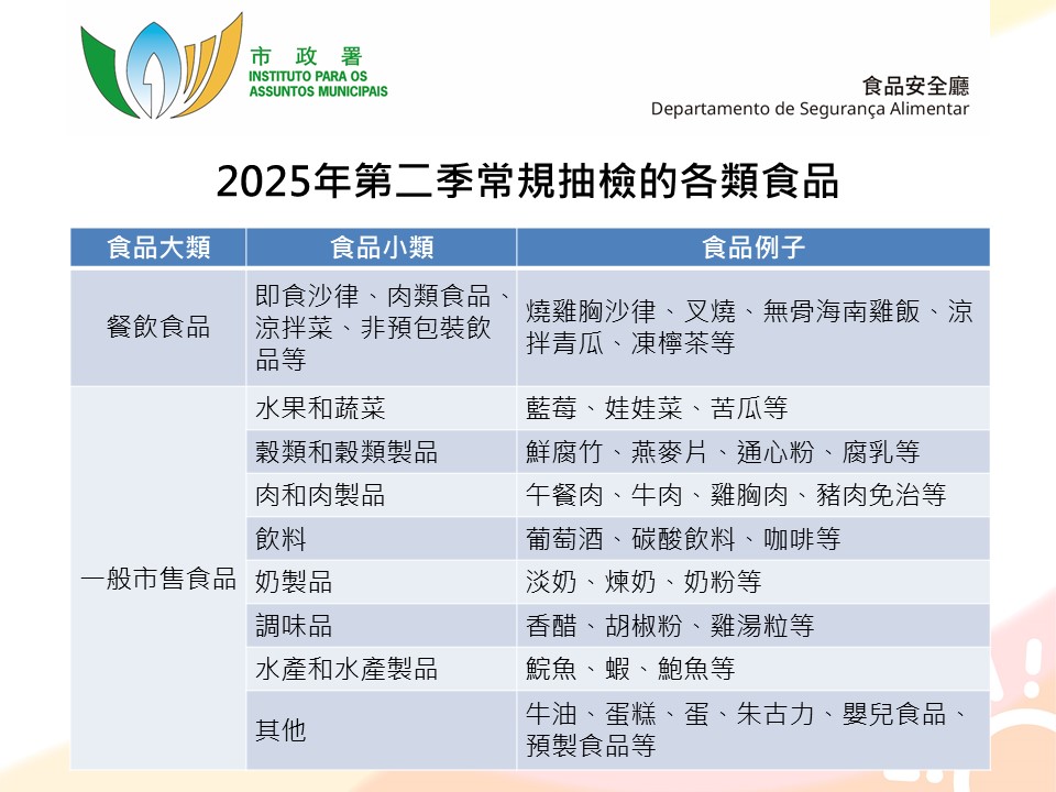 市政署第二季合共抽檢八百一十六個食品樣本中,包括五百五十九個一般市售食品樣本和二百五十七個餐飲食品樣本,抽檢點涵蓋本澳各區食肆、外賣店、熟食中心、超級市場、零售鮮活食品場所及雜貨店等。市政署對相關食品樣本進行了檢測,當中微生物檢測項目包括沙門氏菌屬、單核細胞增生李斯特氏菌、蠟樣芽孢桿菌等常見微生物參數;化學檢測項目包括重金屬、食品添加劑及禁用物質等;全數樣本檢測結果均未見異常。