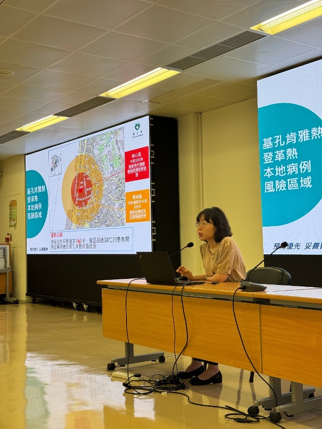 “防控基孔肯雅熱及登革熱”專題講解會向公私營醫療機構醫護人員詳細介紹了基孔肯雅熱和登革熱的流行現狀與風險評估、臨床表現、檢測指徵,疑似病例識別與通報流程,並特別強調醫護人員需提高對疑似病例的警覺性,以達致及早發現、及早通報。而“應對基孔肯雅熱院內防控機制流程”宣導會重點向仁伯爵綜合醫院醫護人員講解了病例住院期間需採取的防蚊措施、院內防控機制流程、防護與環境管理等,以確保發現疑似或確診病例時,能迅速及規範地啟動院內防控機制,從而儘早控制傳染源、保障社區安全。