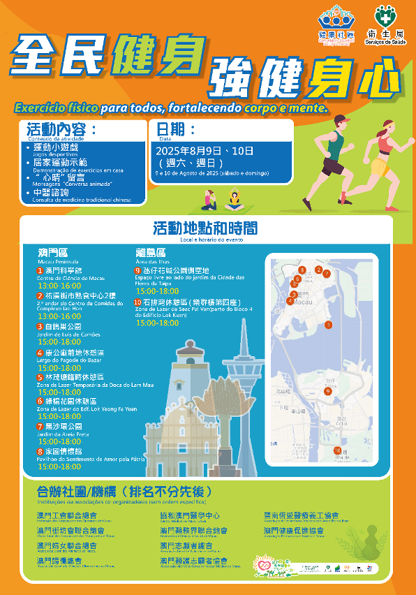 為積極落實“健康社區"計劃推動居民進行規律運動,響應國家8月8日“全民健身日”,以及今年澳門承辦第十五屆全國運動會部份競賽項目,衛生局聯同本澳10個社團機構於本週六、日(8月9日至10日)下午在本澳各區設置10個以“全民健身.強健身心"為主題社區諮詢站,深入社區向居民推廣運動的重要性,營造全民運動和隨時隨地做運動的良好氛圍,促進居民身心健康。活動內容包括:運動小遊戲、居家運動示範、中醫諮詢,以及向居民宣傳防範基孔肯雅熱及登革熱、心理健康等。同時,教育及青年發展局積極響應“全運社區行”活動,將組織志願者走進上述社區諮詢站部份站點,向公眾宣傳“十五運會及殘特奧會”資訊。