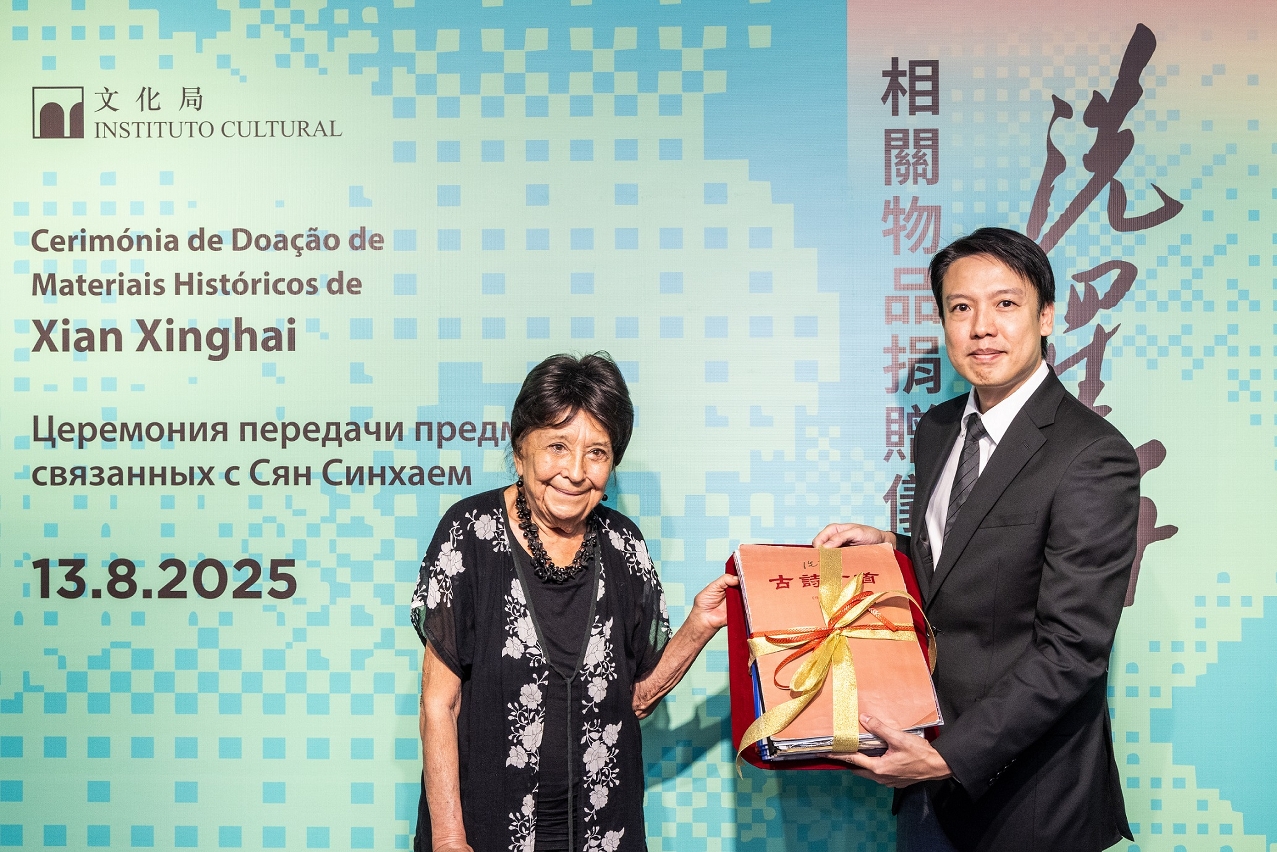 “冼星海相關物品捐贈儀式”今日(8月13日)於澳門冼星海紀念館舉行,哈薩克斯坦音樂家拜卡達莫夫女兒拜卡達莫娃捐出冼星海在哈薩克斯坦的相關物品,包括文件、樂譜、照片等,文化局代局長蔡健龍感謝拜卡達莫娃的慷慨捐贈,指出今年是中國人民抗日戰爭暨世界反法西斯戰爭勝利80周年、冼星海誕辰120周年,是次捐贈別具意義,有關物品是中哈友誼跨越時空的見證,將充實冼星海紀念館館藏,豐富澳門愛國主義教育資源。外交部駐澳門特別行政區特派員公署新聞和公共外交部主任高原參贊、教育及青年發展局代副局長張敏輝、文化局澳門博物館館長盧可茵,以及拜卡達莫娃的家人等一同見證。