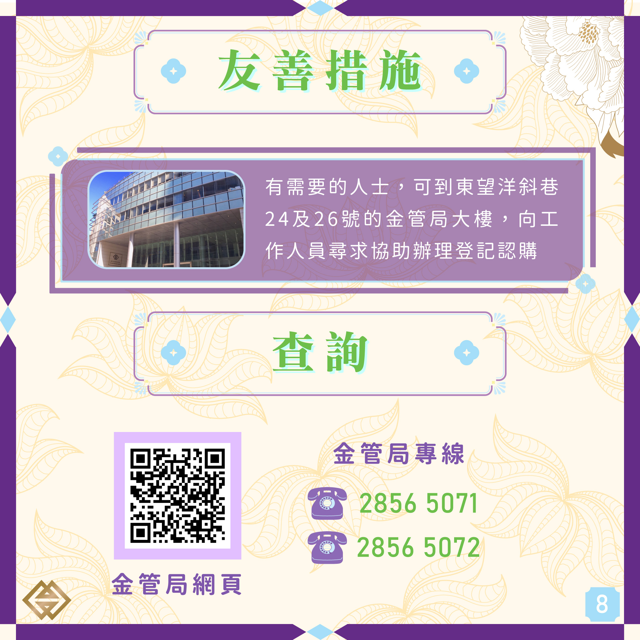 持有澳門特別行政區居民身份證且年滿18歲的人士,可於8月25日上午9時正開始,透過金管局網頁認購登記(https://registration.amcm.gov.mo/COCSCollection/terms_zh.html),登記期至9月12日下午6時正結束。在此期間,金管局大堂將設有專櫃,協助有需要的人士辦理登記認購手續。