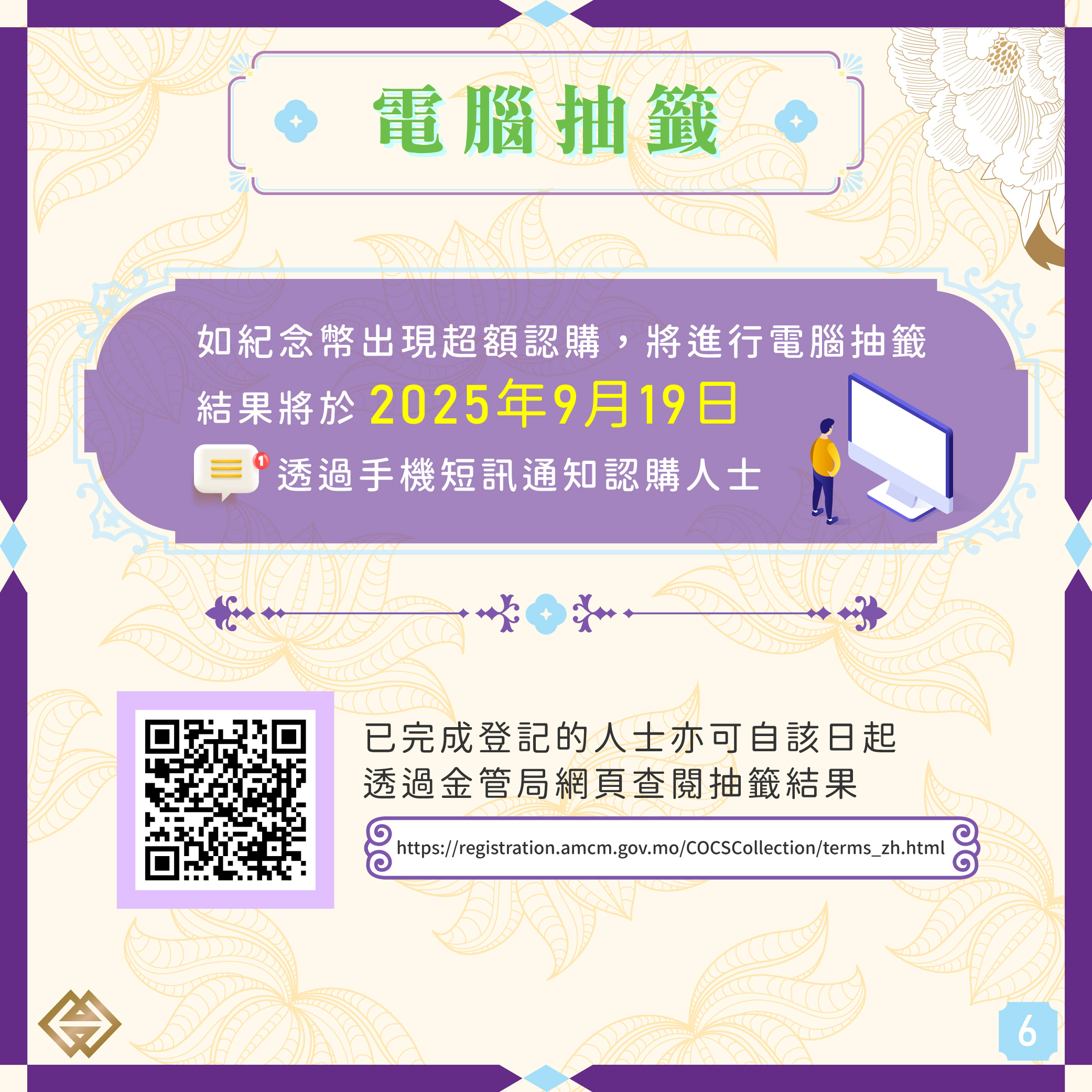 每名澳門居民僅限登記一次,如馬年紀念幣出現超額認購將進行電腦抽籤,抽籤結果將於9月19日透過手機短訊通知認購人士,已完成登記的人士亦可自該日起於金管局網頁查閱抽籤結果。