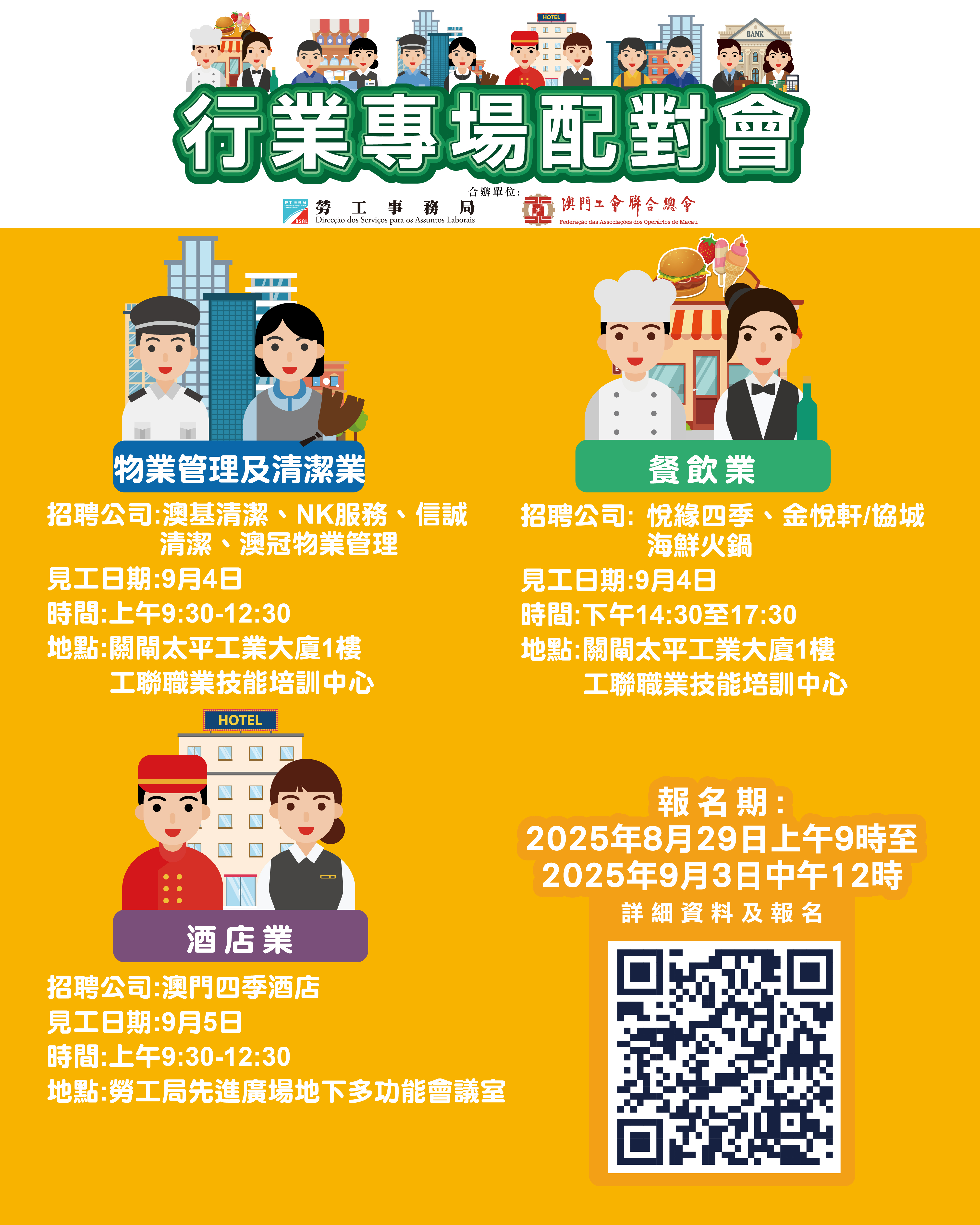 9月4日上午物管及清潔業專場配對會和同日下午餐飲業專場配對會在澳門工聯職業技能培訓中心(關閘馬路101-105A號太平工業大廈第一期1樓)舉行; 9月5日上午酒店業專場配對會在澳門勞工事務局地下多功能會議室(澳門馬揸度博士大馬路221-279號先進廣場大廈)舉行。報名日期為8月29日上午9時至9月3日中午12時。