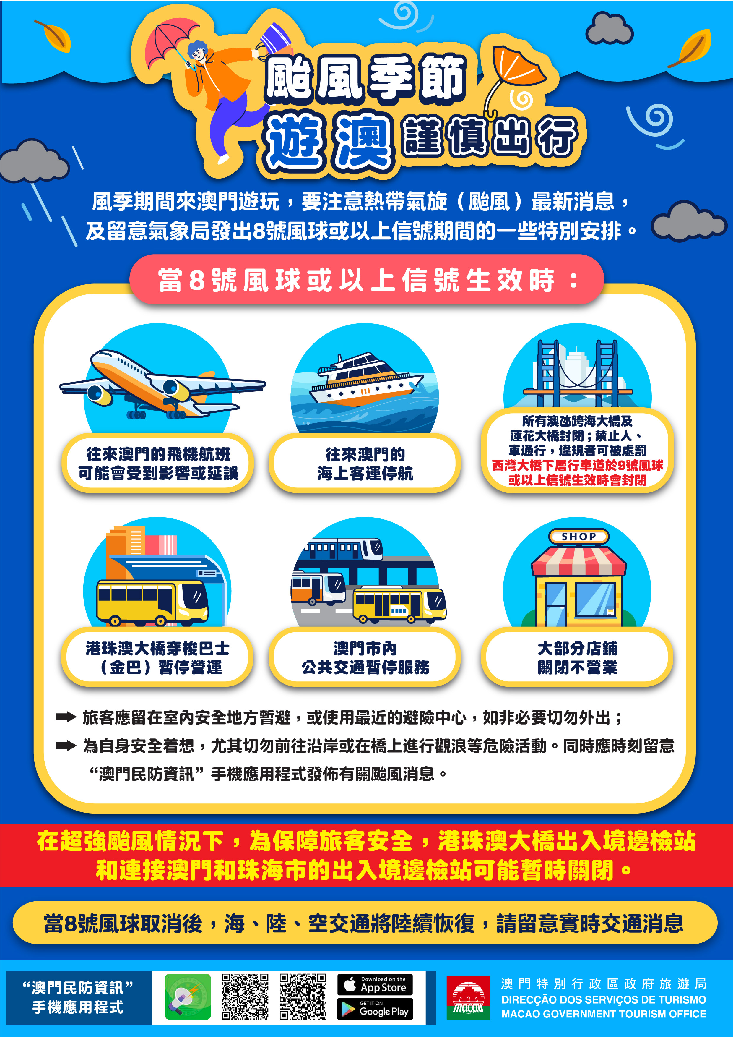 地球物理氣象局已發出3號風球。受熱帶氣旋影響,澳門風力將會增強,旅遊局建議旅客密切留意地球物理氣象局網站(www.smg.gov.mo/zh)及新聞局網站(www.gcs.gov.mo),以獲取最新資訊。