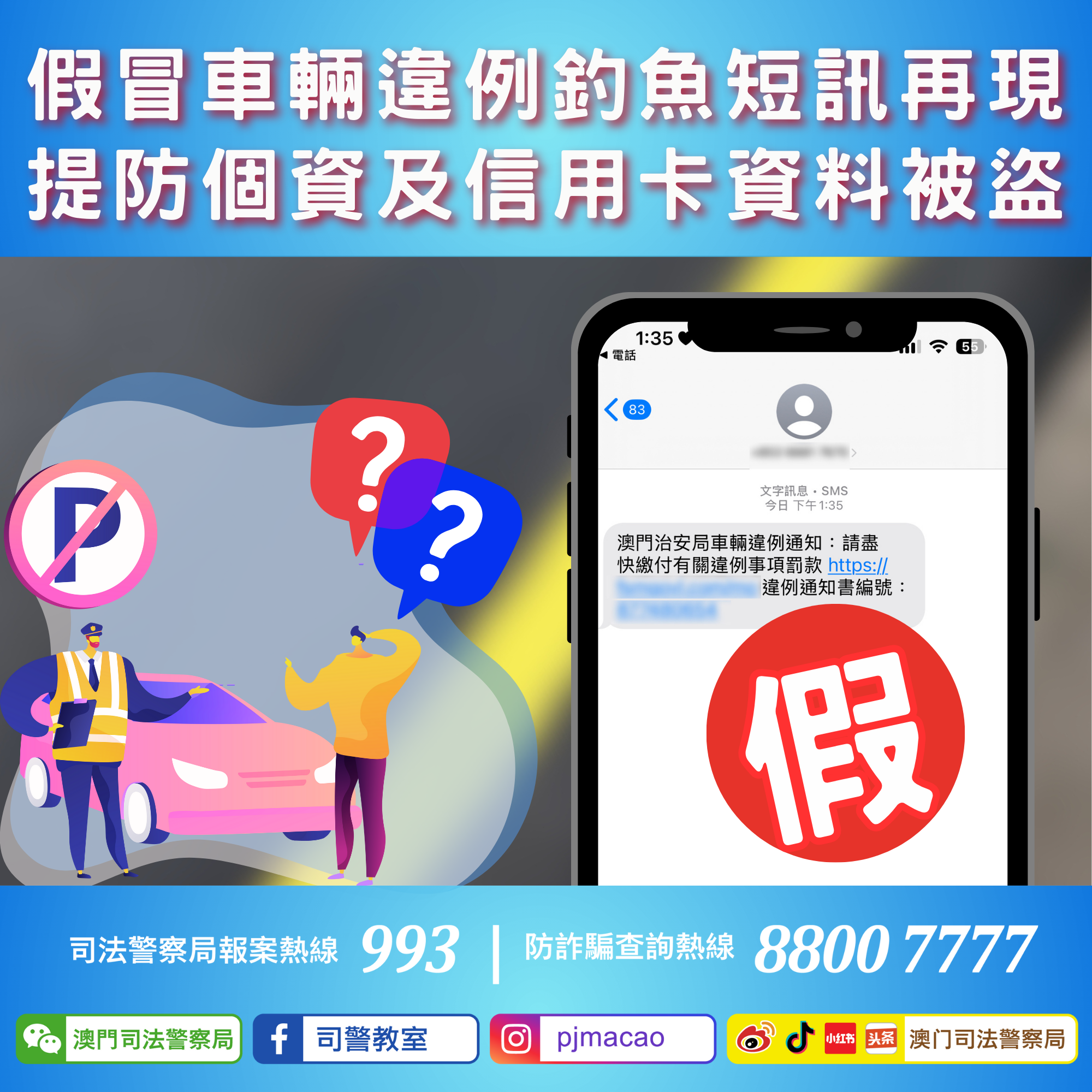 司警局今日再次發現,有騙徒假冒澳門治安警察局,向市民濫發手機短訊。短訊內容訛稱市民有交通違例罰款,並要求透過短訊內附帶的連結進行繳付。若市民點擊該連結,將被引導至一個假冒的「治安警察局交通違例查詢及繳費系統」網頁。